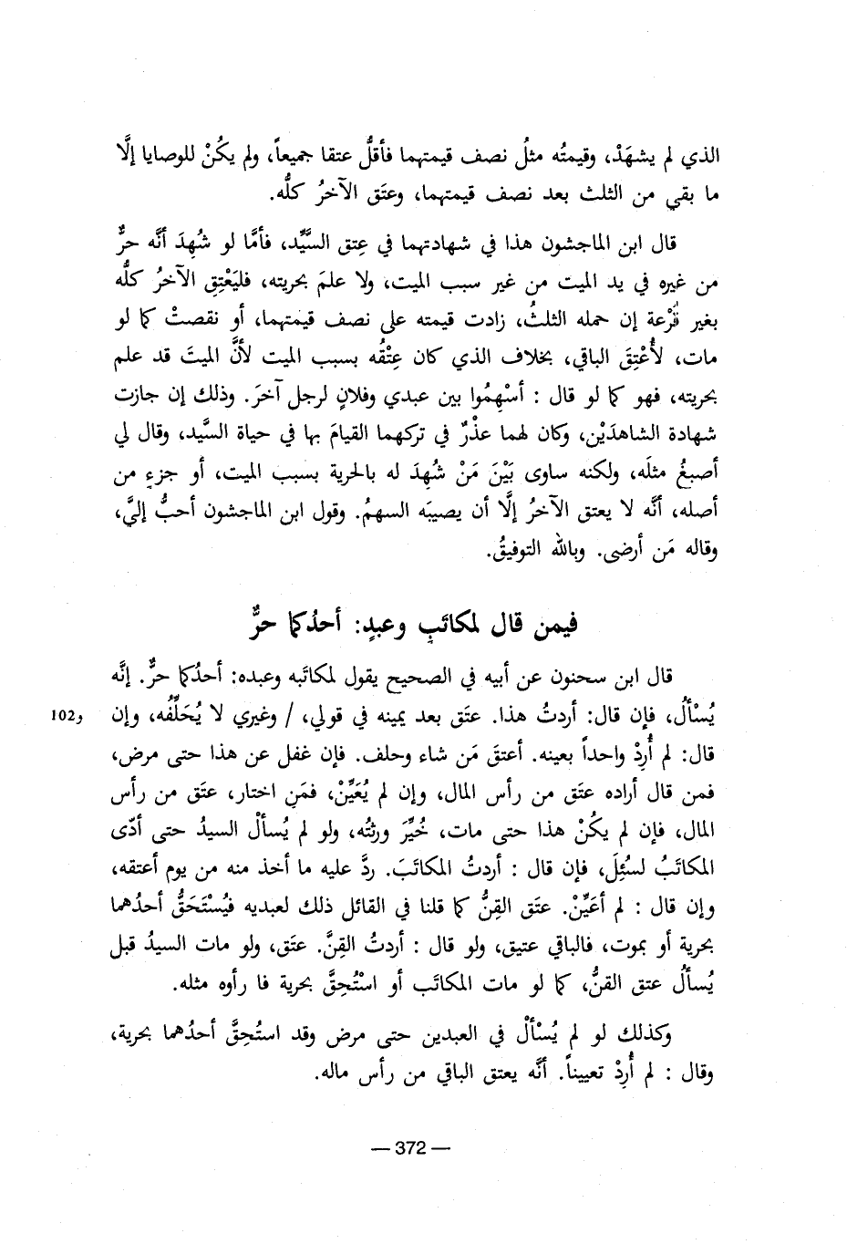 الذى لم يشهد, وقيمته مثل نصف قيمتهما فأقل عتقا جميعا, ولم يكن للوصايا إلا ما بقى من الثلث بعد نصف قيمهما, وعتق الآخر كله. قال ابن الماجشون هذا فى شهادتهما فى عتق السيد, فأما لو شهد انه حر من غيره فى يد الميت من غير سبب الميت, ولا علم بحريته, فليعتق الآخر كله بغير قرعة إن حملهالثلث, زادت قيمة على نصف قيمتهما, او نقصت كما لو مات, لأعتق الباقى, بخلاف الذى كان عتقه بسب الميت لأن الميدت قد علم بحريته, فهو كما قال: أسهموا بين عبيدى وفلان لرجل آخر. وذلك إن جازت شهادة الشاهدين, وكان لهما عذر فى تركهما القيام بها فى حياة السيد, أو جزء من أصله, أنه لا يعتق الآخر إلا أن يصبه السهم. وقول ابن الماجشون أحب إلى, وقاله من رضى وبالله التوفيق. فيمن قال لماكتب وعبد: أحدكما حر قال ابن سحنون عن أبيه فى الصحيح يقول لمكاتبه وعبده: احدكما حر. إنه يسأل, فإن قال: اردت هذا. عتق بعد يمينه فى قولى,/ وغيرى لا يحلفه, وإن قال: لم أرد واحدا بعينه. أعتق من شاء وحلف. فإن غفل عن هذا حتى مرض, فمن قال أراده عتق من رأس المال, وإن لم يعين, فمن اختار, عتق من رأس المال, فإن لم يكن هذا حتى مات, خير ورثته, ولو لم يسأل السيد حتى أدى المكاتب لسئل, فإن قال: لم أعين. عتق القن كما قلنا فى القائل ذلك لعبديه فيستحق أحدهما بحرية أو بموت, فالباقى عتيق, ولو قال: أردت القن. عتق, ولو مات السيد قبل يسأل عتق لاقن, كما لو مات المكاتب أو استحق فا رأوه مثله. وكذلك لو لم يسأل فى العبدين حتى مرض وقد استحق احدهما بحرية وقال: لم أرد تعينا. أنه يعتق الباقى من رأس ماله