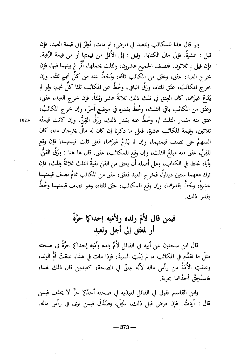 ولو قجال هذا للمكاتب وللعبد فى المرض, ثم مات, نظر إلى قيمة العبد, فإن قيل: عشرة. فإلى مال الكتابة. وقيل: إلى الأقل من قيمتهما أو من قيمة الرقبة. فإن قيل: ثلاثون. فنصف الجميع عشرون, والثلث يحملها, اقرع بينهما فيها, فإن خرج العبد, عت, وعتق من المكاتب ثلثه, ويحط عنه من كل نجم ثلثه, وغن خرج المكاتب, عتق ثلثاه, ورق الباقى, وحط عن الماكتب ثلثا كل نجم, ولو لم يدع غيرهما, كان العتق فى ثلث ذلك ثلاثة عشر وثلثاه, فإن خرج العبد, عتق, وعتق من المكاتب باقى الثلث, وحط بقدره فى موضع آخر, وغن خرج المكاتب, عتق منه بمقدار الثلث/, وحط عنه بقدر ذلك, ورق القن, وإن كانت قيمته ثلاثين, وقيمة المكاتب عشرة, فعلى ما ذكرنا إن كان له مال يخرجان منه, كان السهم على نصف قيمتهما, وإن لم يدع غيرهما, فعلى ثلث قيمتهما, فإن وقع للقن, عتق منه مبلغ الثلث, وإن وقع للمكاتب, عتق. قال ها هنا: ورق القن. وأرواه غلط فى الكتاب, وعلى أصله أن يعتق من القن بقية الثلث ثلاثة وثلث, فإن ترك معهما ستين دينارا, فخرج العبد فعتق, عتق من المكاتب تمام نصف قيمتهما عشرة, وحط بقدرهما, وإن وقع للمكاتب, عتق ثلثاه, وهو نصف قيمتهما وحط بقدر ذلك. فيمن قال لأم ولأمته إحداكما حرة او لمعتق إلى أجل ولعبد قال ابن سحنون عن أبيه فى القائل لأم ولده وأمته إحداكما حرة في صحته مثل ما تقدم في المكاتب ما لم يمت السيد, فإذا مات في هذا, عتقت أم الولد, وعتقت الأمة من رأس ماله لأنه عتق في الصحة, كعبديين قال ذلك لهما, فاستحق أحدهما بحرية. وابن القاسم يقول فى القائل لعبديه فى صحته احدكما حر لا يحلف فيمن قال: أردت. فإن مرض ذلك, سئل, وصدق فيمن نوى فى رأسه ماله