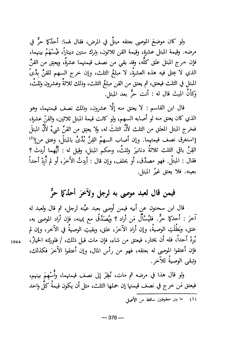 ولو كان موضع الموصى بعتقه مبتل فى المرض, فقال لهما: أحدكما حر فى مرضه. قيمته المبتل عشرة, وقيمة القن ثلاثون, ترك ستين دينارا, فيسهم بينهما, فإن خرج المبتل عتق كله, وقد بقى من نصف قيمتهما عشرة, ويعتق من القن الذى لا عتق فيه هذه العشرة, لا مبلغ الثلث, وغن خرج السهم للقن بدى االمبتل فى الثلث فيعتق, ثم يعتق من القن مبلغ الثلث, وذلك ثلاثة وعشرون وثلث, وكأن النميت قال له: انت حر بعد المبتل. قال ابن القاسم: لا يعتق منه إلا عشرون, وذلك نصف قيمتهما, وهو الذى كان يعتق منه لو أصابه السهم, ولو كانت قيمة المبتل ثلاثي, والقن عشرة, فخرج المبتل المعتق من الثلث لأن الثلث له, ولا يعتق من القن شىء لأن المبتل (استغرق نصف قيمتهما. وإن أصاب السهم القن بدى بالمتبل, وعتق من) (¬1) القن باقى الثلث ثلاثة دنانيروثلث, وحكم المبتل, وقيل له: أيهما أردت؟ بعينه. فلا يعتق غير المبتل. فيمن قال لعبد موصى به لرجل ولآخر احدكما حر قال ابن سحنون عن ابيه فيمن أوصى بعبد لرجل, ثم قال ولعبد له آخر: احدكما حر. فليسأل متن أراد من أراد؟ ويصدق مع يمينه, فإن أراد الموصى به, عتق, وبطلبت الوصية, وإن أراد الاخر, عتق, وبطلت الوصية, وغن أراد الآخر, عتق, وبقيت الوصية فى الآخر, وغن لم يرد احدا, فله ان يختار, فيعتق من شاء, فإن مات قبل ذذلك,/ فلورثته الخيار, فإن اعتقوا الموصى له بعتقه, فهو من رأس المال, وغن اعتقوا الآخر فذلك وتبقى الوصية للآخر. ولو قال فى مرضه ثم مات, نظر إلى نصف قيمتها, وأسهم بينهم, فيعتق من خرج فى نصف قيمتها لإن حملها الثلث, مثل ان يكون قيمة كل واحد