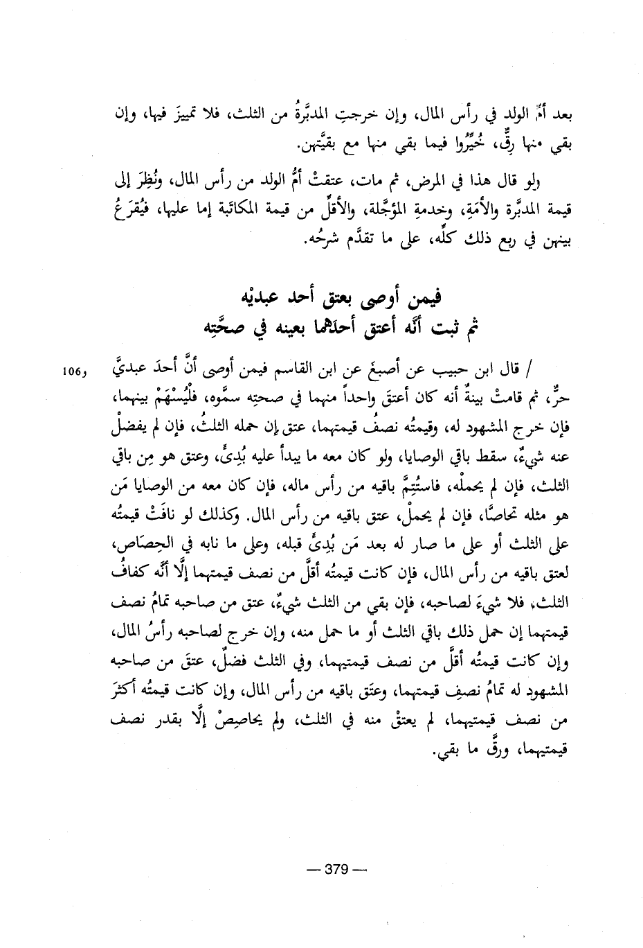 بعد أم الولد فى رأس المال, وإن خرجت المدبرة من الثلث, فلا تمييز فيها, وغن بقى منها رق, خيروا فيما بقى منها مع بقيتهن. ولو قال هذا المرض, ثم مات عتقت أم الولد من رأس المال, ونظر إلى قيمة المدبرة والأمة, وخدمة المؤجلة, والأقل من قيمة المكاتبة إما عليها, فيقرع بينهن فى ربع ذلك كله, على ما تقدم شرحه. فيمن اوصى بعتق احد عبديه ثم ثبت أنه اعتق أحدهما بعينه فى صحته/ قال ابن حبيب عن اصبغ عن القاسم فيمن أوصى أن أحد عبدى حر, ثم قامت بينه انه كان اعتق واحدا منهما فى صحته سموه, فليسهم بينهما, فإن خرج المشهود له, وقيمته نصف قيمتهما, عتق معه ما يبدأ عليه بدىء, وعتق هو من باقى الثلث, فإن لم يحمله, فاستتم باقيه من رأس ماله, فإن كان معه من الوصايا من هو مثله تحاصا, فإن لم يحمل, عتق من رأس المال. وكذلك لو نافت قيمته على الثلث او على ما صار له بعد بدى قبله, وعلى نما نابه فى الحصاص, لعتق باقيه من رأس المال, فإن كانت قيمته اقل من نصف قيمتهما إلا أنه كفاف الثلث, فلا شىء لصاحبه, فإن بقى من الثلث شىء, عتق صاحبه تمام نصف قيمتهما إن حمل ذلك باقى الثلث أو ما حمل منه, وإن خرج لصاحبه رأس المال, وإن كانت قيمته أقل من نصف قيمتهما, وفى الثلث فضل, عتق صاحبه المشهود له تمام نصف قيمتهما, وعتق باقيه من رأس المال, وإن كانت قيمته أكثر من نصف قيمتهما, لم يعتق منه فى الثلث, ولم يحاصص إلا بقدر نصف قيمتهما, ورق ما بقى