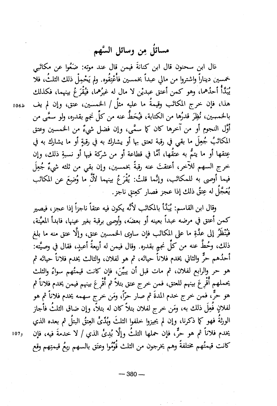 مسائل من وسائل السهم قال ابن سحنون قال ابن كنامة فيمن قال عند موته: ضعوا عن مكاتبى خمسين دينارا واشتروا من مالى عبدا بخمسين فأعتقوه. لم يحمل ذلك الثلث, فلا يبدأ احدهما, هو كمن أعتق عبدين لا مال له غيرهما, فيقرع بينهما, فذللك هذا, فإن خرج المكاتب وقيمة ما عليه مثل/ الخمسين, عتق, وإن لم يف بالخمسين, نظر قدرها من الكتابة, فيحط عنه من كل نجم بقدره, ولو سمى من اول النجوم أو من آخرها كان كما سمى, وإن فضل شىء من الخمسين وعتق المكاتب جعل ما بقى فى رقبة تعتق بها أو يشارك به فى رقبة أو ما يشارك به فى عتقها أو ما يتم به عتقها, اما فى قطاعه أو من شركة فيها او نسبة ذل, وإن خرج السهم للآخر, اعتقت عنه رقبة بخمسين, وإن بقى من ثلثه شىء جعل فيما أوصى به للمكاتب, وإنما قلت: يقرع بينهما لأن ما وضع عن المكاتب يعجل له عتق ذلك إذا عجز فصار كعتق ناجز. وقال ابن القاسم: يبدأ بالمكاتب لأنه يكون فيه عتقا ناجزا إذا عجز, فيصير كمن أعتق فى مرضه عبدا بعينه أو بعضه, وأوصى برقبة بغير عينها, فابدأ المعينة, فينظر إلى عدة ما على المكاتب فإن ساوى الخمسين عتق, وإلا عتق منه ما بلغ ذلك, وحط عنه من كل نجم بقدره. قال فيمن له أربعة أعبد, فقال فى وصيته: احدهم حر والثانى يخدم فلانا حياته, ثم هو لفلان, والثلث يخدم فلانا حياته ثم هو حر والرابع لفلان, ثم مات قبل ان يبين, فإن كانت قيمتهم سواء والثلث يحملهم اقرع بينهم للعتق, فمن خرج عتق بتلا ثم أقرع بينهم فيمن يخدم فلانا ثم هو حر, فمن خرج خدم المدة ثم صار حرا, ومن خرج سهمه يخدم فلانا ثم هو لفلان فعل به, ومن خرج لفلان بتلا كان له بتلا, وإن ضاق الثلث فأجاز الورثة فهو كما ذكرنا, وإن لم يجيزوا خلفوا الثلث وبدى العتق البتل ثم بعده الذى يخدم فلانا ثم هو حر, فإن حملها الثلث وإلا بدى الذى/ لا خدمة فيه, فإن كانت قيمتهم مختلفة وهم يخرجون من الثلث قوموا وعتق بالسهم ربع قيمتهم وقع