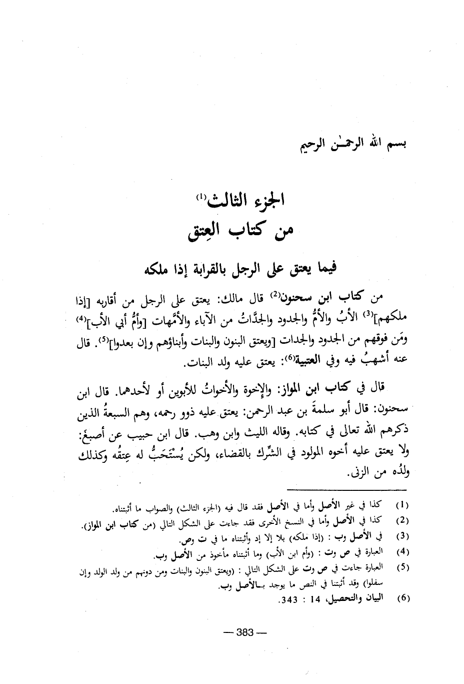 (¬5) العبارة جاءت فى ص وت على الشكل التاى: (وبعتق البنونوالبنات ومن دونهم ولد الولد وإن سلفوا) وقد أثبتاه فى انص ما يوجد بالاصل وب