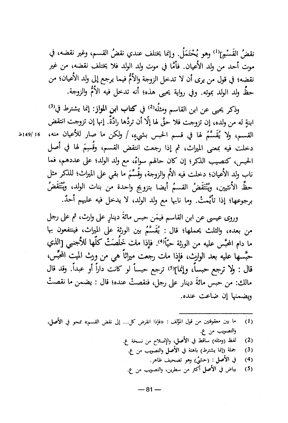 نقض القَسْمٍ] (¬1) وهو يُحْتَمَلُ. وإنما يختلف عندي نقض القسم، وغير نقضه، في موت أحد من ولد الأعيان. فأما في موت ولد الولد فلا يختلف نقضه، من غير نقضه؛ في قول من يرى أن لا تدخل الزوجة والأم فيما يرجع إلى ولد الأعيان؛ من حظ ولد الولد بموته. وفي رواية يحيى هذه؛ أنه تدخل فيه الأم والزوجة. وذكر يحيى عن ابن القاسم ومثله (¬2) في كتاب ابن المواز: إنما يشترط في (¬3) في كتاب ابن المواز: إنما يشترط في (¬4) ابنة له من ولده، إن تزوجت فلا حق لها إلا أن تردها رادة. إنها إن تزوجت انتقض القسم، ولا يُقَسَّمُ لها في قسم الحبس بشيء، /ولكن ما صار للأعيان منه، دخلت فيه بمعنى الميراث، ثم إذا رجعت انتقض القسم، وقُسِمَ لها قي أصل الحبس، كنصيب الذكر؛ إن كان حالهم سواء، مع ولد الولد؛ على عددهم، فما ناب ولد الأعيان؛ دخلت فيه الأم والزوجة، وقُسَّمَ ما بقي على الميراث؛ للذكر مثل حظ الأنثيين، ويُنْتَقَضُ القسم أيضا بتزويج واحدة من بنات الولد، ويُنْتَقَضُ برجوعها؛ إذا تأيمت. وما نابها مع ولد الولد، لا يدخل يه عليهم أحد. وروى عيسى عن ابن القاسم فيمن حبس مائة دينار على وارث، ثم على رجل من بعده، والثلث يحملها؛ قال: يُقَسَّمُ بين الورثة على الميراث، فينتفعون بها ما دام المحبس عليه من الورثة حيا (¬5).فإذا مات خَلُصَتْ كلها للأجنبي [الذي حبسها عليه بعد الوارث، فإذا مات رجعت ميراثا هي من ورث الميت المحبس، قال: ولا ترجع حبسا، وإنما] (¬6) ترجع حبسا لو كانت دارا أو عبدا. وقد قال مالك: من حبس مائة دينار على رجل، فنقصت عنده؛ قال: يضمن ما نقصت ويضمنها إن ضاعت عنده.