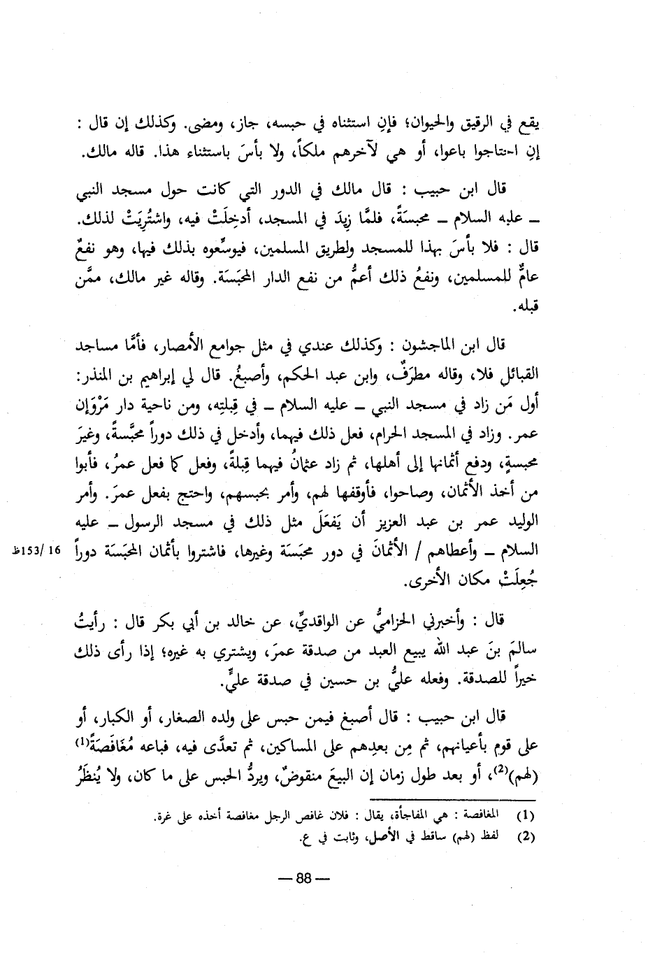 يقع في الرقيق والحيوان؛ فإن استثناه في حبسه، جاز، ومضى. وكذلك إن قال: إن احتاجوا باعوا، أو هي لآخرهم ملكا، ولا بأس باستثناء هذا. قاله مالك. قال ابن حبيب: قال مالك في الدور التي كانت حول مسجد النبي- عليه السلام- محبسة، فلما زيد في المسجد، أدخلت فيه، واشتُرِيَتْ لذلك. قال: فلا بأس بهذا للمسجد ولطريق المسلمين؛ فيوسعوه بذلك فيها، وهو نفع عام للمسلمين، ونفع ذلك أعم من نفع الدار المحبسة. وقاله غير مالك، ممن قبله. قال ابن الماجشون: وكذلك عندي في مثل جوامع الأمصار، فأما مساجد القبائل فلا، وقاله مطرف، وابن عبد الحكم، وأصبغ. قال لي إبراهيم بن المنذر: أول من زاد في مسجد النبي- عليه السلام- في قبلته، ومن ناحية دار مَرْ وإن عمر. وزاد في المسجد الحرام، فعل ذلك فيهما، وأدخل في ذلك دورا محبسة، وغير محبسة، ودفع أثمانها إلى أهلها، ثم زاد عثمان فيهما قبلة، وفعل كما فعل عمر، فأبوا من أخذ الأثمان، وصاحوا، فأوقفها لهم، وأمر بحبسهم، واحتج بفعل عمر. وأمر الوليد عمر بن عبد العزيز أن يفعل مثل ذلك في مسجد الرسول- عليه السلام- وأعطاهم/ الأثمان في دور محبسة وغيرها، فاشتروا بأثمان المحبسة دورا جُعِلَتْ مكان الأخرى. قال: وأخبرني الحزامي عن الواقدي، عن خالد بن أبي بكر قال: رأيت سالم بن عبد الله يبيع العبد من صدقة عمر، ويشتري به غيره؛ إذا رأى ذلك خيراً للصدقة. وفعله علي بن حسين في صدقة علي. قال ابن حبيب: قال أصبغ فيمن حبس على ولده الصغار، أو الكبار، أو على قوم بأعيانهم، ثم من بعدهم على المساكين، ثم تعدى فيه، فباعه مُغَافَصَةً (¬1) (لهم) (¬2)، أو بعد طول زمان إن البيع منقوض، ويرد الحبس على ما كان، ولا يُنظَرُ