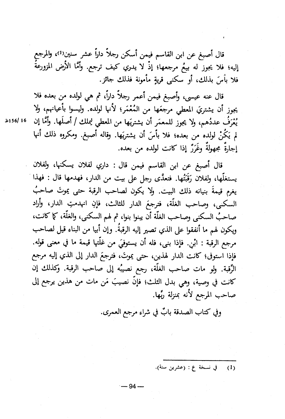 قال أصبغ عن ابن القاسم فيمن أسكن رجلا دارا عشر سنين (¬1)، والمرجع إليه؛ فلا يجوز له بيع مرجعها؛ إذ لا يدري كيف ترجع. وأما الأرض المزورعة فلا بأس بذلك، أو سكنى قرية مأمونة فذلك جائز. قال عنه عيسى، وأصبغ فيمن أعمر رجلا دارا، ثم هي لولده من بعده فلا يجوز أن يشتري المعطي مرجعها من المُعْمَر؛ لأنها لولده. وليسوا بأعيانهم، ولا يُعْرَفُ عددهم، ولا يجوز للمعمر أن يشتريها من المعطي ليملك/ أصلها. وأما إن لم يَكُنْ لولده من بعده؛ فلا بأس أن يشتريها. وقاله أصبغ. ومكروه ذلك أنها إجارة مجهولة وغرر إذا كانت لولده من بعده. قال أصبغ عن ابن القاسم فيمن قال: داري لفلان يسكنها، ولفلان يستغلها، ولفلان رقبتها. فتعدى رجل على بيت من الدار، فهدمها قال: فهذا يغرم قيمة بنيانه ذلك البيت. ولا يكون لصاحب الرقبة حتى يموت صاحب السكنى، وصاحب الغلة، فترجع الدار للثالث، فإن انهدمت الدار، وأراد صاحب السكنى وصاحب الغلة أن بينوا بنوا، ثم لهم السكنى، والغلة، كما كانت، ويكون لهم ما أنفقوا على الذي تصير إليه الرقبة. وإن أبيا من البناء قيل لصاحب مرجع الرقبة: ابْنِ. فإذا بنى، فله أن يستوفي من غلتها قيمة ما في معنى قوله. فإذا استوفى؛ كانت الدار لهذين، حتى يموت، فترجع الدار إلى الذي إليه مرجع الرقبة. ولو مات صاحب الغلة، رجع نصيبه إلى صاحب الرقبة. وكذلك إن كانت في وصية، وهي بدل الثلث؛ فإن نصيب من مات من هذين يرجع إلى صاحب المرجع لأنه بمنزلة ربها. وفي كتاب الصدقة باب في شراء مرجع العمرى.
