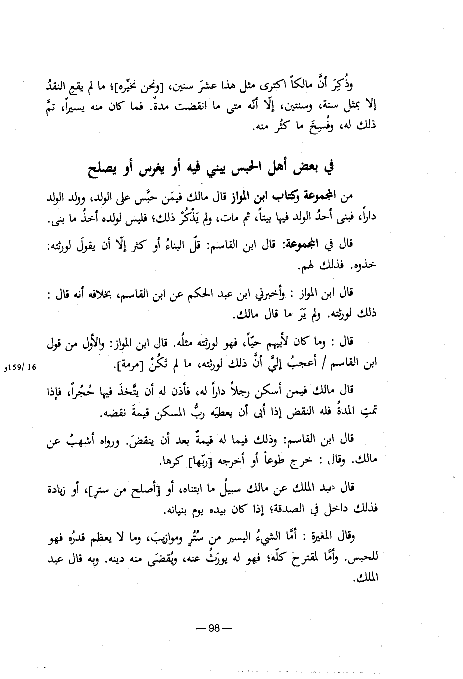 وذُكِرَ أن مالكا اكترى مثل هذا عشر سنين، [ونحن نخيره]؛ ما لم يقع النقد إلا بمثل سنة، وسنتين، إلا أنه متى ما انقضت مدة. فما كان منه يسيرا، تم ذلك له، وفُسِخَ ما كثر منه. في بعض أهل الحبس بيني فيه أو يغرس أو يصلح من المجموعة وكتاب ابن المواز قال مالك فيمن حبس على الولد، وولد الولد دارا، فبنى أحد الولد فيها بيتا، ثم مات، ولم يَذْكُرْ ذلك؛ فليس لولده أخذ ما بنى. قال في المجموعة: قال ابن القاسم: قل البناء أو كثر إلا أن يقول لورثته: خذوه. فذلك لهم. قال ابن المواز: وأخبرني ابن عبد الحكم عن ابن القاسم، بخلافه أنه قال: ذلك لورثته. ولم ير ما قال مالك. قال: وما كان لأبيهم حيا، فهو لورثته مثله. قال ابن المواز: والأول من قول ابن القاسم/ أعجب إلي أن ذلك لورثته، ما لم تكن [مرمة]. قال مالك فيمن أسكن رجلا دارا له، فأذن له أن يتخذ فيها حُجُراً، فإذا تمت المدة فله النقض إذا أبى أن يعطيه رب المسكن قيمة نقضه. قال ابن القاسم: وذلك فيما له قيمة بعد أن ينقض. ورواه أشهب عن مالك. وقال: خرج طوعا أو أخرجه [ربها] كرها. قال عبد الملك عن مالك سبيل ما ابتناه، أو [أصلح من ستر]، أو زيادة فذلك داخل في الصدقة؛ إذا كان بيده يوم بنيانه. وقال المغيرة: أما الشيء اليسير من سُتُرِ وموازيب، وما لا يعظم قدره فهو للحبس. وأما لمقترح كله؛ فهو له يورث عنه، ويُقضَى منه دينه. وبه قال عبد الملك.