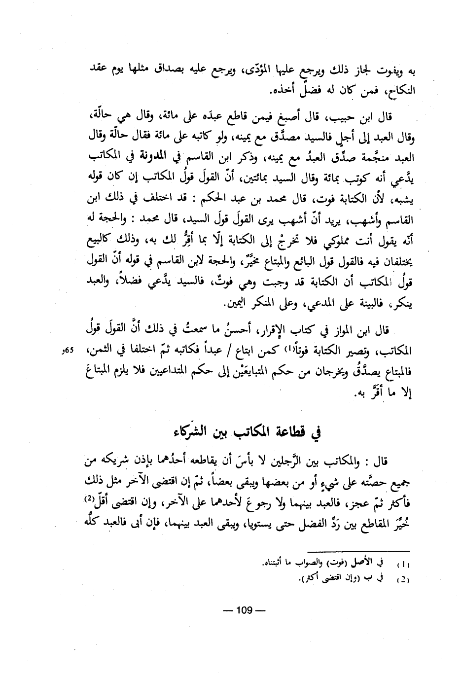 قال: والمكاتب بين الرجلين لا بأس أن يقاطعه أحدهما بإذن شريكه من جميع حصته على شيء أو من بعضها ويبقى بعضاً، ثم اقتضى الآخر مثل ذلك فأكثر ثم عجز، فالعبد بينهما ولا رجوع لأحدهما على الآخر، وإن اقتضى أقل (¬2) خير المقاطع بين رد الفضل حتى يستويا، ويبقى العبد بينهما، فإن أبى فالعبد كله