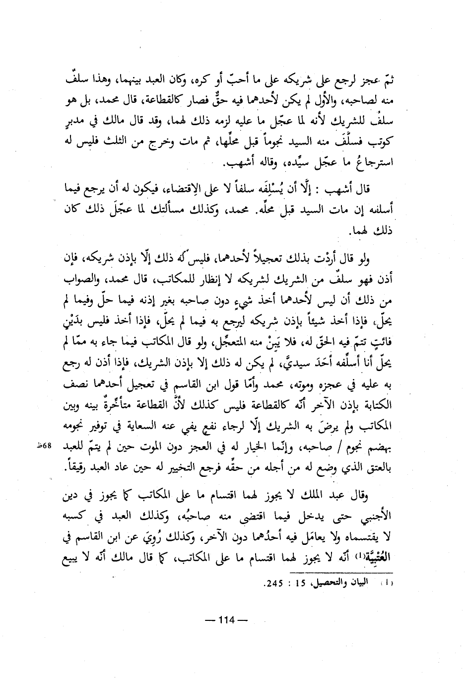 ولو قال أردت بذلك تعجيلا لأحدهما، فليس له ذلك إلا بإذن شريكه، فإن أذن فهو سلف من الشريك لشريكه لا إنظار للمكاتب، قال محمد، والصواب من ذلك أن ليس لأحدهما أخذ شيء دون صاحبه بغير إذنه فيما حل وفيما لم يحل، فإذا أخذ شيئا بإذن شريكه ليرجع به فيما لم يحل، فإذا أخذ فليس بدين فائت تتم فيه الحق له، فلا يبين منه المتعجل، ولو قال المكاتب فيما جاء به مما لم يحل أنا أسلفه أحد سيدي، لم يكن له ذلك إلا بإذن الشريك، فإذا أذن له رجع به عليه في عجزه وموته، محمد وأما قول ابن القاسم في تعجيل أحدهما نصف الكتابة بإذن الآخر أنه كالقطاعة فليس كذلك لأن القطاعة متأخرة بينه وبين المكاتب ولم يرض به الشريك إلا لرجاء نفع يفي عنه السعاية في توفير نجومه بهضم نجوم/ صاحبه، وإنما الخيار له في العجز دون الموت حين لم يتم للعبد بالعتق الذي وضع له من أجله من حقه فرجع التخيير له حين عاد العبد رقيقا.