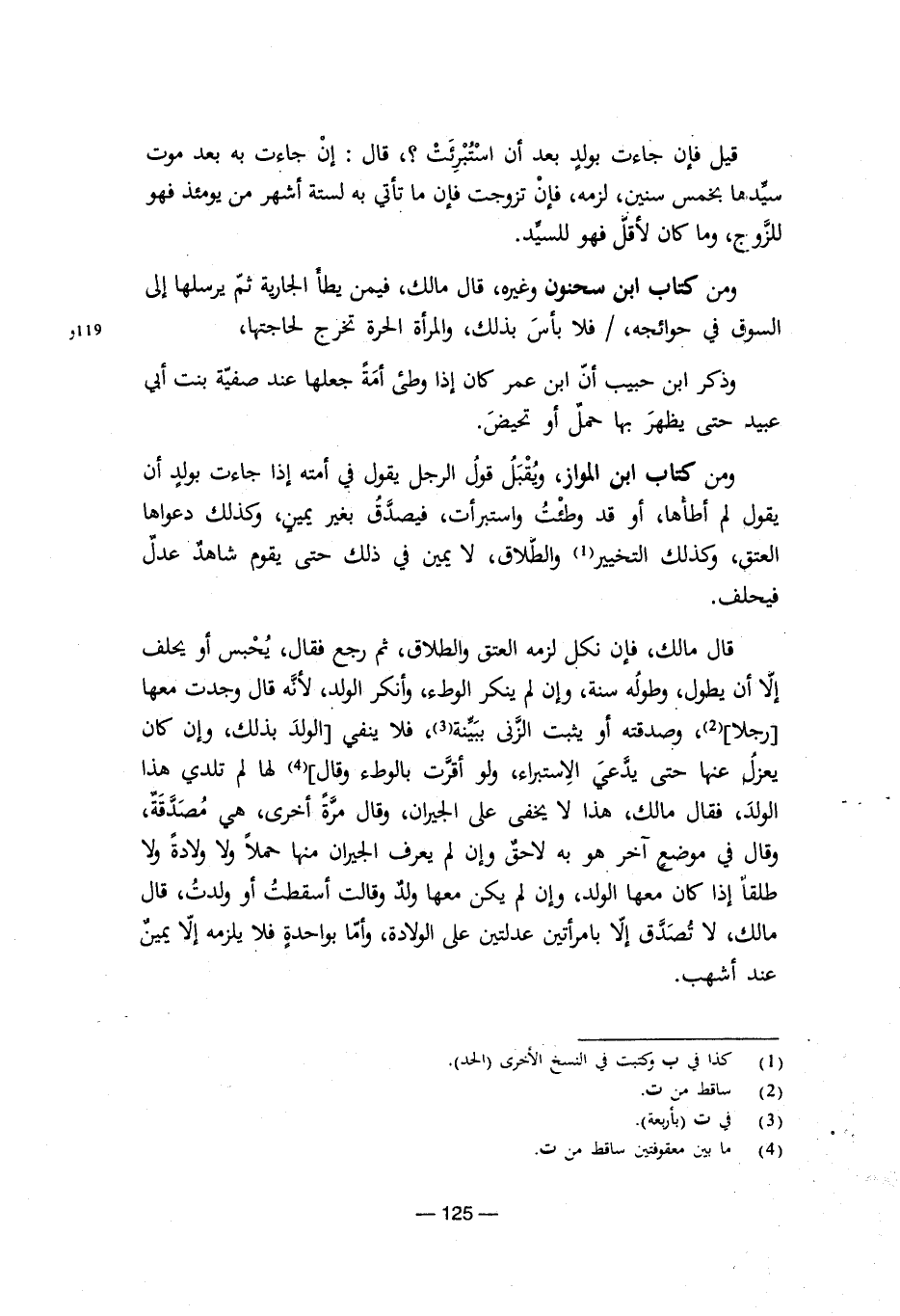 قال مالك، فإن نكل لزمه العتق والطلاق، ثم رجع فقال، يحبس أو يحلف إلا أن يطول، وطوله سنة، وإن لم ينكر الوطء، وأنكر الولد، لأنه قال وجدت معها [رجلا] (¬2)، وصدقته أو يثبت الزنى ببينة (¬3)، فلا ينفي [الولد بذلك، وإن كان يعزل عنها حتى يدعي الاستبراء، ولو أقرت بالوطء وقال] (¬4) لها لم تلدي هذا الولد، فقال مالك، هذا لا يخفى على الجيران، وقال مرة أخرى، هي مصدقة، وقال في موضع آخر هو به لاحق وإن لم يكن معها ولد وقالت أسقطت أو ولدت، قال مالك، لا تصدق إلا بامرأتين عدلتين على الولادة، وأما بواحدة فلا يلزمه إلا يمين عند أشهب.