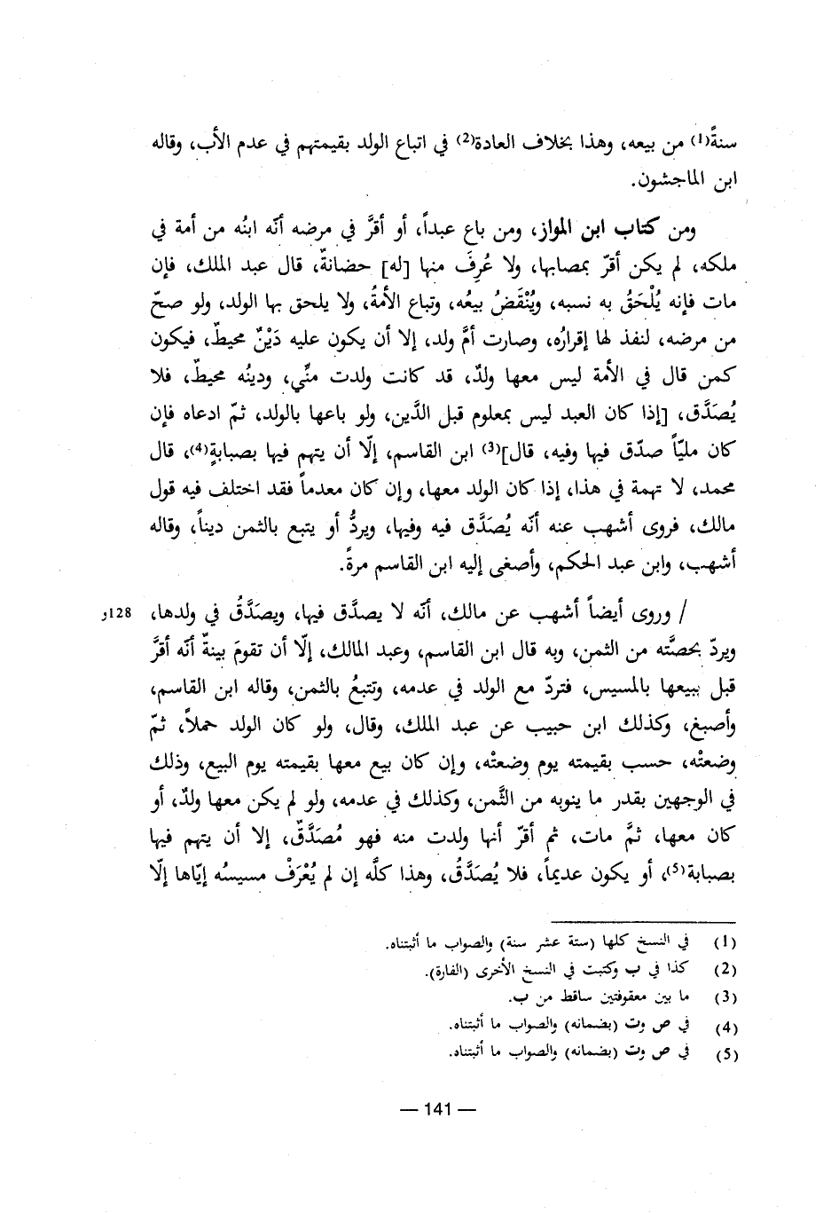سنة (¬1) من بيعه، وهذا بخلاف العادة (¬2) في اتباع الولد بقيمتهم في عدم الأب، وقاله ابن الماجشون.
