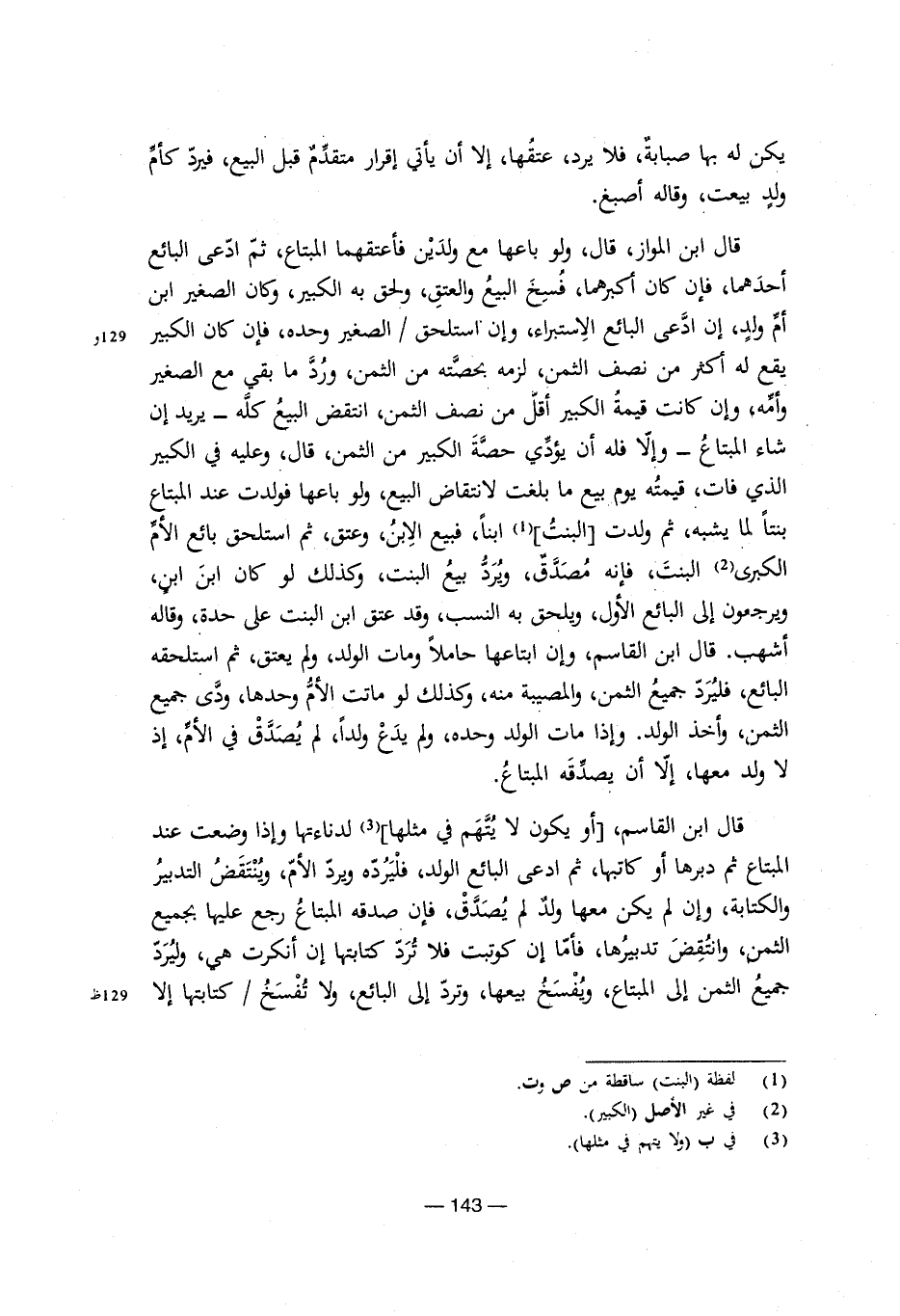 قال ابن القاسم، [أو يكون لا يتهم في مثلها] (¬3) لدناءتها وإذا وضعت عند المبتاع ثم دبرها أو كاتبها، ثم ادعى البائع الولد، فليرده ويرد الأم، وينتقض التدبير والكتابة، وإن لم يكن معها ولد لم يصدق، فإن صدقه المبتاع رجع عليها بجميع الثمن، وانتقض تدبيرها، فأما إن كوتبت فلا ترد كتابتها إن أنكرت هي، وليرد جميع الثمن إلى المبتاع، ويفسخ بيعها، وترد إلى البائع، ولا تفسخ/ كتابتها إلا