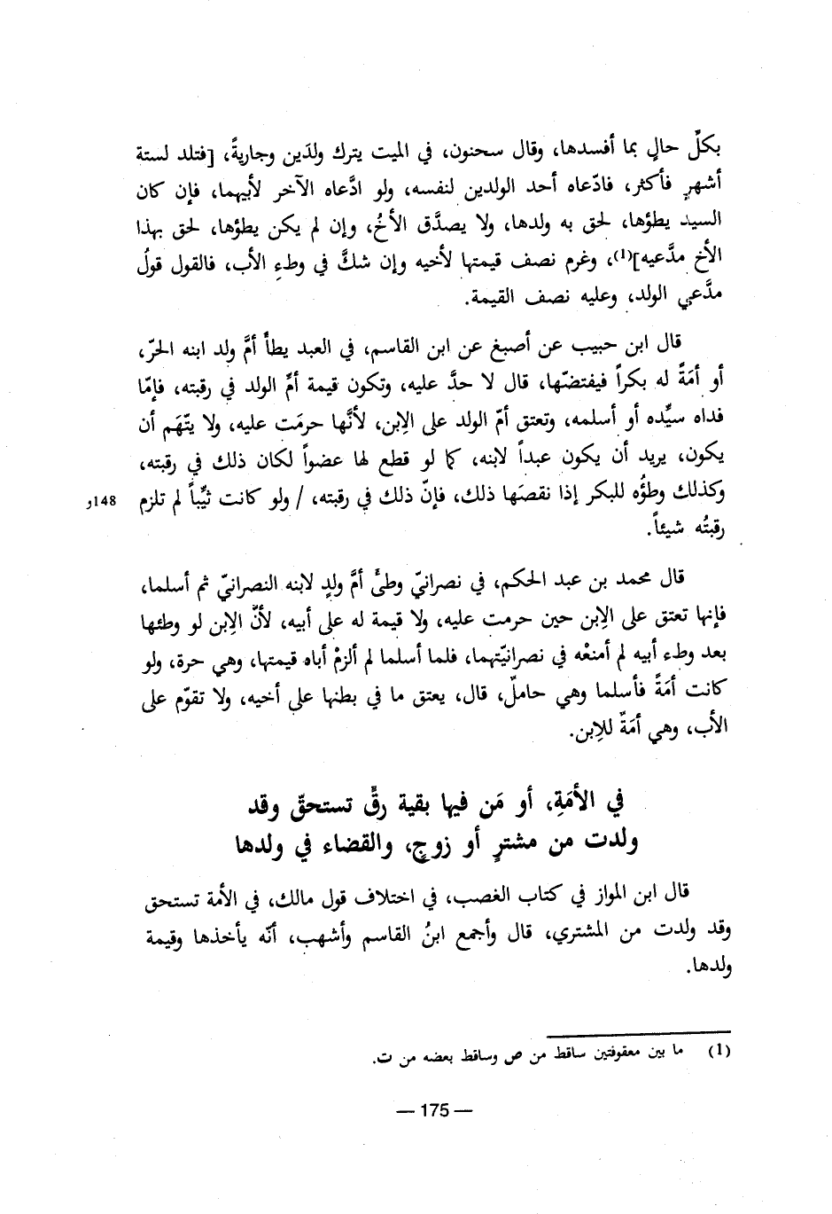 بكل حال بما أفسدها، وقال سحنون، في الميت يترك ولدين وجارية، [فتلد لستة أشهر فأكثر، فادعاه أحد الولدين لنفسه، ولو ادعاه الآخر لأبيهما، فإن كان السيد يطؤها، لحق به ولدها، ولا يصدق الأخ، وإن لم يكن يطؤها، لحق بهذا الأخ مدعيه] (¬1)، وغرم نصف قيمتها لأخيه وإن شك في وطء الأب، قالقول قول مدعي الولد، وعليه نصف القيمة.