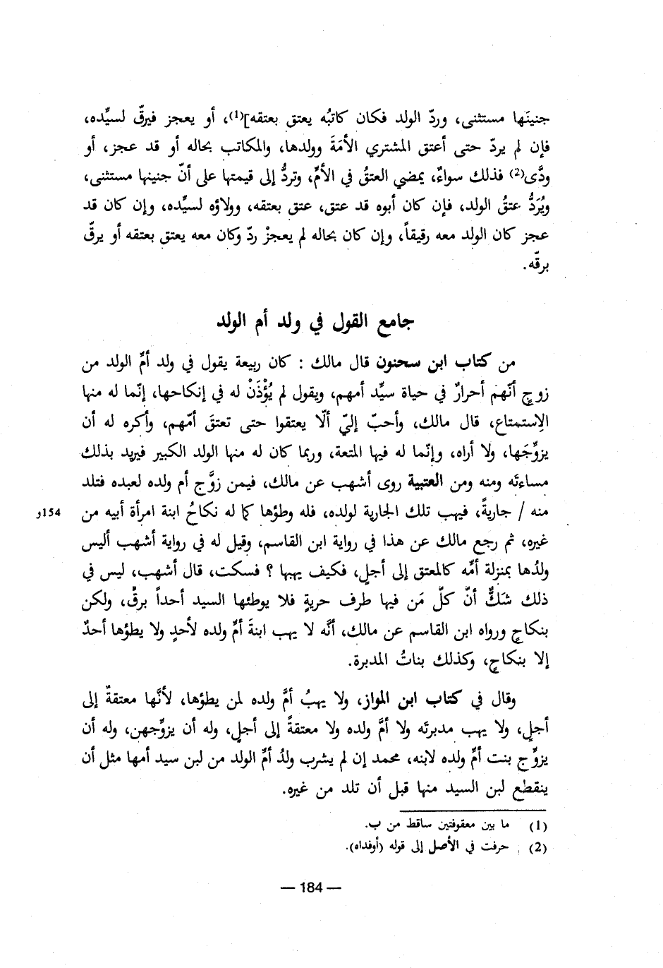 من كتاب ابن سحنون قال مالك: كان ربيعة يقول في ولد أم الولد من زوج أنهم أحرار في حياة سيد أمهم، ويقول لم يؤذن له في إنكاحها، إنما له منها الاستمتاع، قال مالك، وأحب إلي ألا يعتقوا حتى تعتق أمهم، وأكره له أن يزوجها، ولا أراه، وإنما له فيها المتعة، وربما كان له منها الولد الكبير فيريد بذلك مساءته ومن ومن العتبية روى أشهب عن مالك، فيمن زوج أم ولده لعبده فتلد منه/ جارية، فيهب تلك الجارية لولده، فله وطؤها كما له نكاح ابنة امرأة أبيه من غيره، ثم رجع مالك عن هذا في رواية ابن القاسم، وقيل له في رواية أشهب أليس ولدها بمنزلة أمه كالمعتق إلى أجل، فكيف يهبها؟ فسكت، قال أشهب، ليس في ذلك شك أن كل من فيها طرف حرية فلا يطئها السيد أحداً برق، ولكن بنكاح ورواه ابن القاسم عن مالك، أنه لا يهب ابنة أم ولده لأحد ولا يطؤها أحد إلا بنكاح، وكذلك بنات المدبرة.