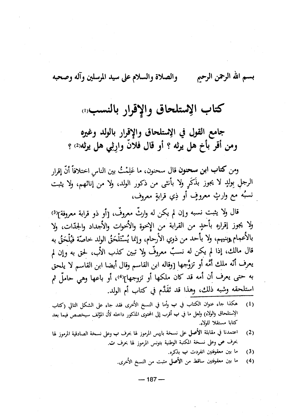 (¬1) هكذا جاء عنوان الكتاب في ب وأما في النسخ الأخرى فقد جاء على الشكل التالي (كتاب الاستلحاق والولاء) ولعل ما في ب أقرب إلى المحتوى المذكور داخله لأن المؤلف سيخصص فيما بعد كتابا مستقلا للولاء.