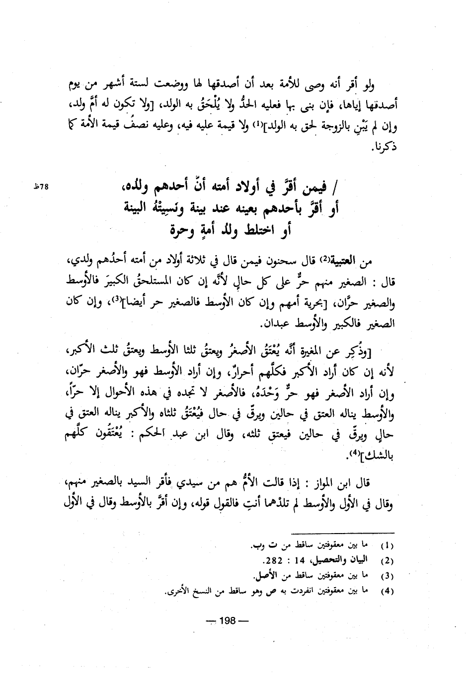 من العتبية (¬2) قال سحنون فيمن قال في ثلاثة أولاد من أمته أحدهم ولدي، قال: الصغير منهم حر على كل حال لأنه إن كان المستلحق الكبير فالأوسط والصغير حران، [بحرية أمهم وإن كان الأوسط فالصغير حر أيضا] (¬3)، وإن كان الصغير فالكبير والأوسط عبدان.