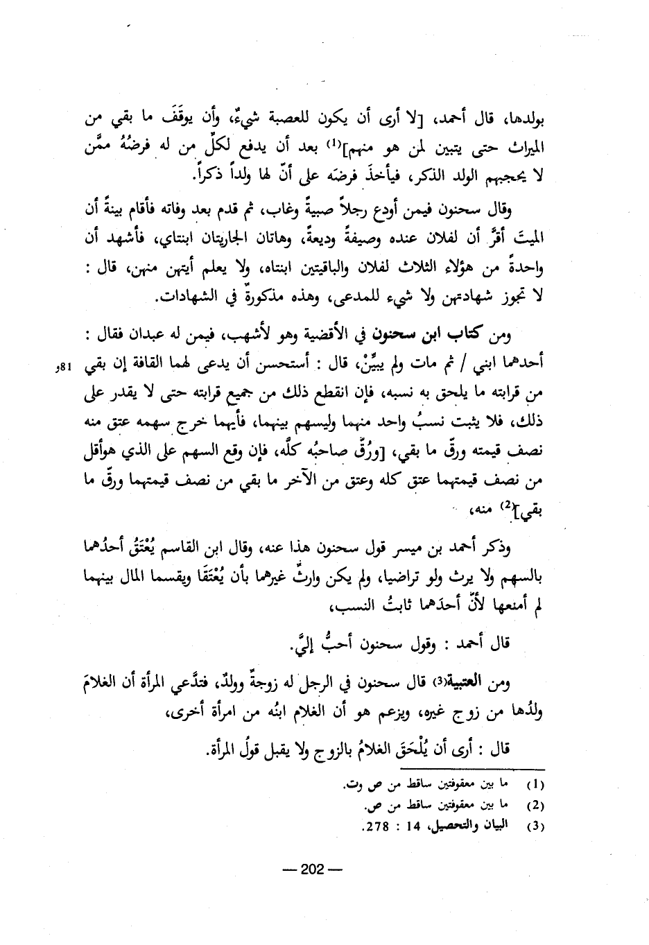 ومن كتاب ابن سحنون في الأقضية وهو لأشهب، فيمن له عبدان فقال: أحدهما ابني/ ثم مات ولم يبين، قال: أستحسن أن يدعى لهما القافة إن بقي من قرابته ما يلحق به نسبه، فإن انقطع ذلك من جميع قرابته حتى لا يقدر على ذلك، فلا يثبت نسب واحد منهما وليسهم بينهما، فأيهما خرج سهمه عتق منه نصف قيمته ورق ما بقي، [ورق صاحبه كله، فإن وقع السهم على الذي هو أقل من نصف قيمتهما عتق كله وعتق من الآخر ما بقي من نصف قيمتهما ورق ما بقي] (¬2) منه،