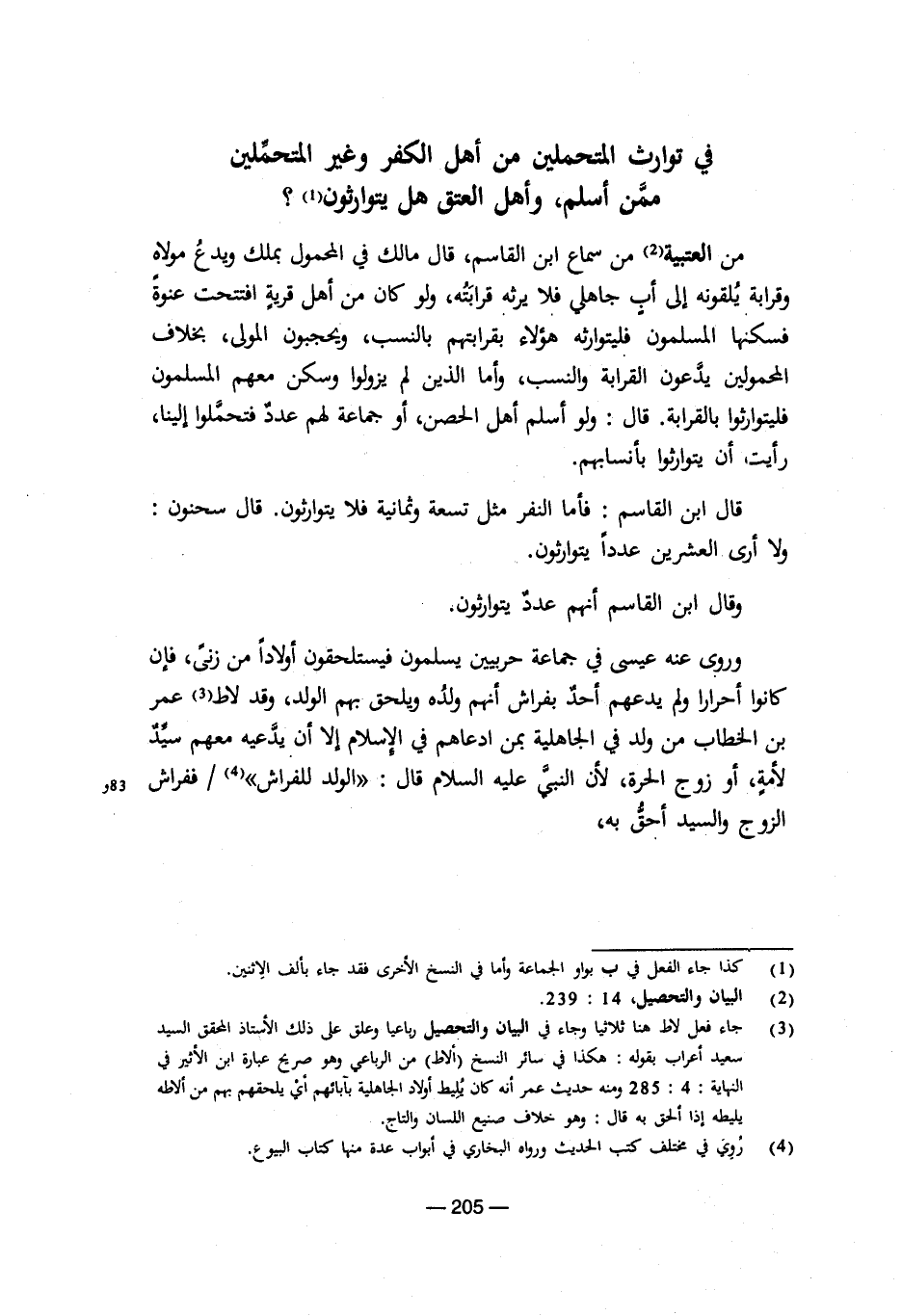 (¬3) جاء فعل لاط هنا ثلاثيا وجاء في البيان والتحصيل رباعيا وعلق على ذلك الأستاذ المحقق السيد سعيد أعراب بقوله: هكذا في سائر النسخ (ألاط) من الرباعي وهو صريح عبارة ابن الأثير في النهاية:4: 285 ومنه حديث عمر أنه كان يليط أولاد الجاهلية بآبائهم أي يلحقهم بهم من ألاطه يليطه إذا ألحق به قال: وهو خلاف صنيع اللسان والتاج.