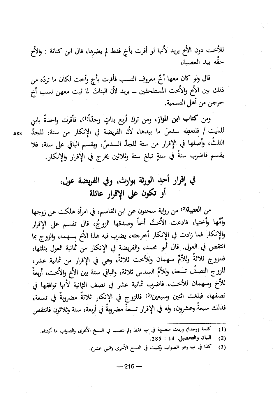 من العتبية (¬2) من رواية سحنون عن ابن القاسم، في امرأة هلكت عن زوجها وأمها وأختها، فادعت الأخت أخا وصدقها الزوج، قال تقسم على الإقرار والإنكار فما زادت في الإنكار أخرجته، يضرب فيه هذا الأخ بسهمه، والزوج بما انتقص في العول. قال أبو محمد، والفريضة في الإنكار من ثمانية العول بثلثها، فللزوج ثلاثة وللأم سهمان وللأخت ثلاثة، وهي في الإقرار من ثمانية عشر، للزوج النصف تسعة، وللأم السدس ثلاثة، والباقي ستة بين الأخ والأخت، أربعة للأخ وسهمان للأخت، فاضرب ثمانية عشر في النصف الثمانية لأنها توافقها في نصفها، فبلغت اثنين وسبعين (¬3) فللزوج في الإنكار ثلاثة مضروبة في تسعة، فذلك سبعة وعشرون، وله في الإقرار تسعة مضروبة في أربعة، ستة وثلاثون فانتقص