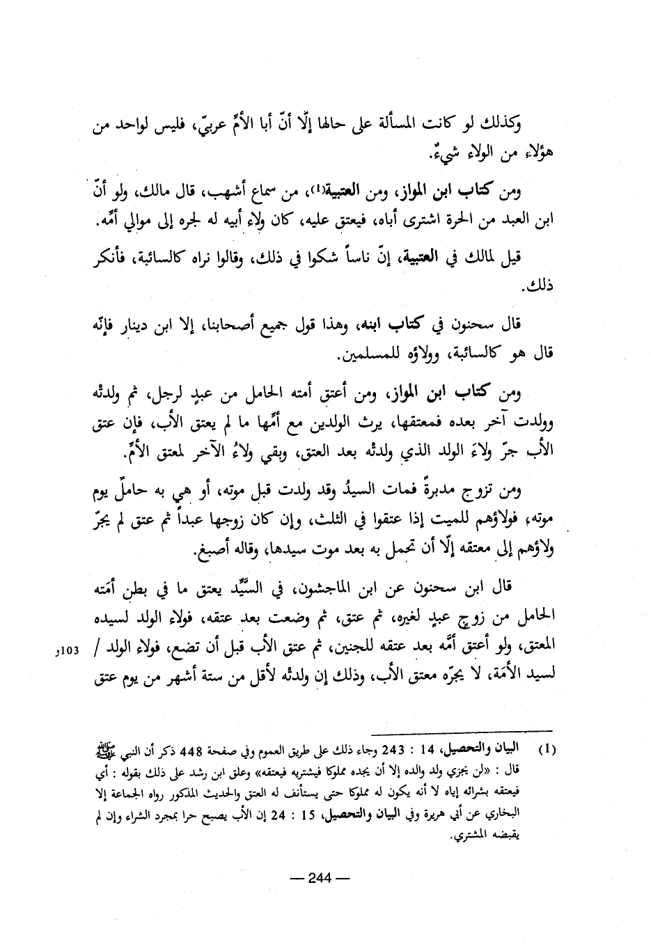 (¬1) البيان والتحصيل، 14: 243 وجاء ذلك على طريق العموم وفي صفحة 448 ذكر أن النبي صلى الله عليه وسلم قال: «لن يجزي ولد والده إلا أن يجده مملوكا فيشتريه فيعتقه» وعلق ابن رشد على ذلك بقوله: أي فيعتقه بشرائه إياه لا أنه يكون له مملوكا حتى يستانف له العتق والحديث المذكور رواه الجماعة إلا البخاري عن أبي هريرة وفي البيان والتحصيل، 15: 24 إن الأب يصبح حرا بمجرد الشراء وإن لم يقبضه المشتري.
