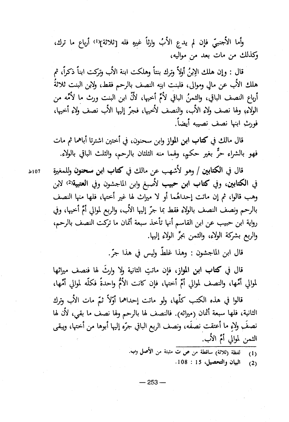 قال في الكتابين/ وهو لأشهب عن مالك في كتاب ابن سحنون وللمغيرة في الكتابين، وفي كتاب ابن حبيب لأصبغ وابن الماجشون في العتبية (¬2) لابن وهب قالوا، ثم إن ماتت إحداهما أو ميراث لها غير أختها، فلها منها النصف بالرحم ونصف النصف بالولاء فقط بما جر إليها الأب، والربع لموالي أم أخيها، وفي رواية ابن حبيب عن ابن القاسم أنها تأخذ سبعة أثمان ما تركت النصف بالرحم، والربع بشركة الولاء، والثمن بجر الولاء إليها.