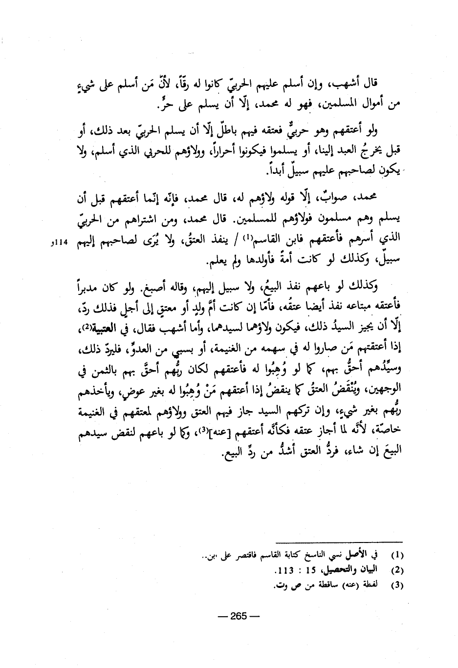 محمد، صواب، إلا قوله ولاؤهم له، قال محمد، فإنه إنما أعتقهم قبل أن يسلم وهم مسلمون فولاؤهم للمسلمين. قال محمد، ومن اشتراهم من الحربي الذي أسرهم فأعتقهم فابن القاسم (¬1) / ينفذ العتق، ولا يرى لصاحبهم إليهم سبيل، وكذلك لو كانت أمة فأولدها ولم يعلم.