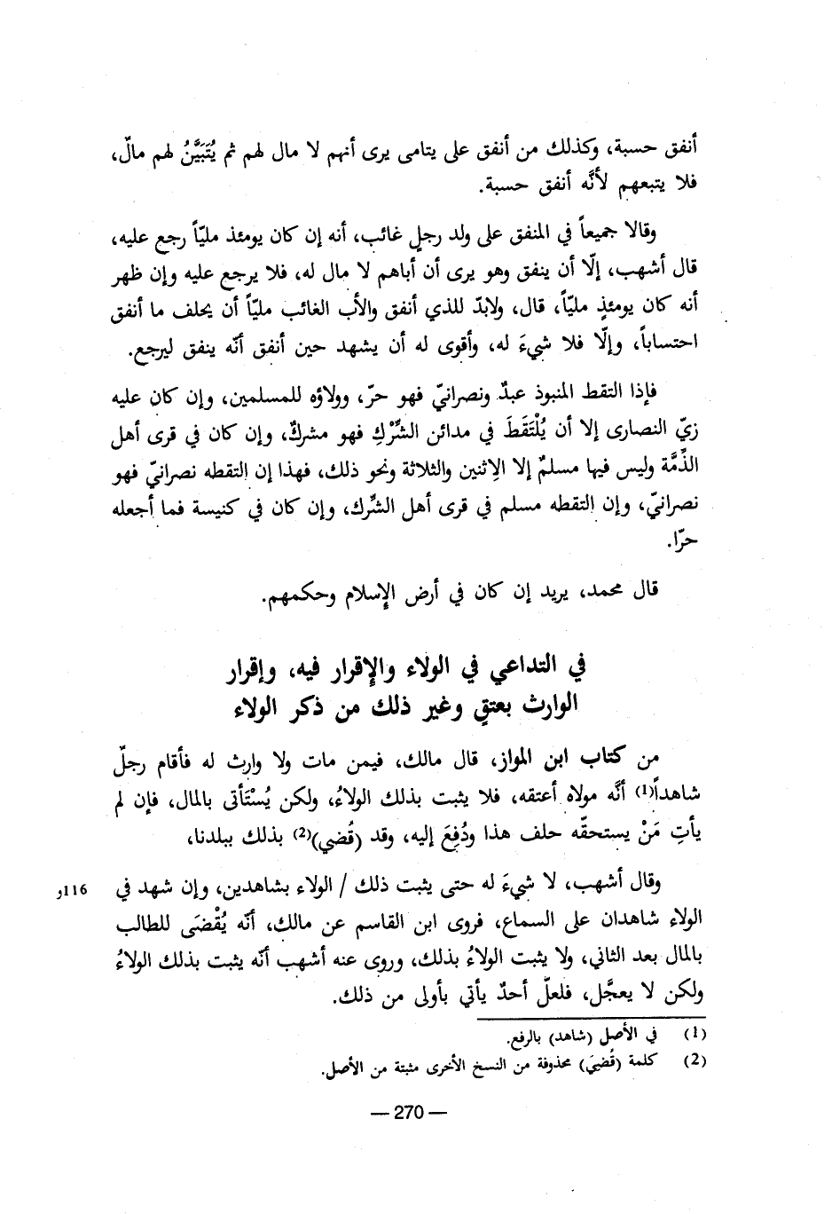 وقال أشهب، لا شيء له حتى يثبت ذلك/ الولاء بشاهدين، وإن شهد في الولاء شاهدان على السماع، فروى ابن القاسم عن مالك، أنه يقضى للطالب بالمال بعد الثاني، ولا يثبت الولاء بذلك، وروى عنه أشهب أنه يثبت بذلك الولاء ولكن لا يجعل، فلعل أحد يأتي بأولى من ذلك.