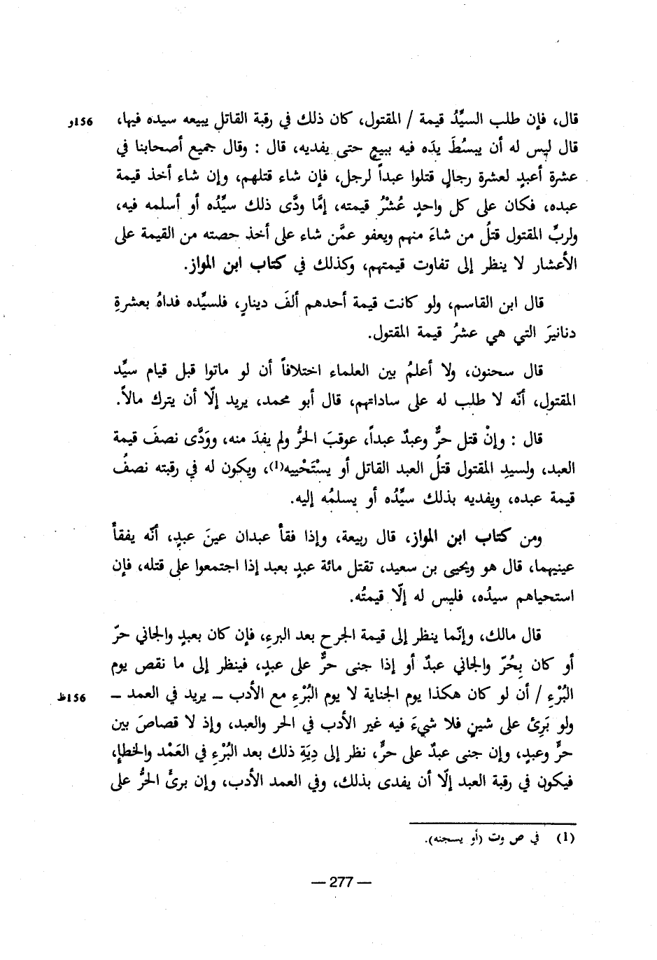 قال مالك، وإنما ينظر إلى قيمة الجرح بعد البرء، فإن كان بعبد والجاني حر أو كان بحر والجاني عبد أو إذا جنى حر على عبد، فينظر إلى ما نقص يوم البرء/ أن لو كان هكذا يوم الجناية لا يوم البرء مع الأب- يريد في العمد- ولو برئ على شين فلا شيء فيه غير الأدب في الحر والعبد، وإذ لا قصاص بين حر وعبد، وإن جنى عبد على حر، نظر إلى دبة ذلك بعد البرء في العمد والخطإ، فيكون في رقبة العبد إلا أن يفدي بذلك، وفي العمد الأدب، وإن برئ الحر على