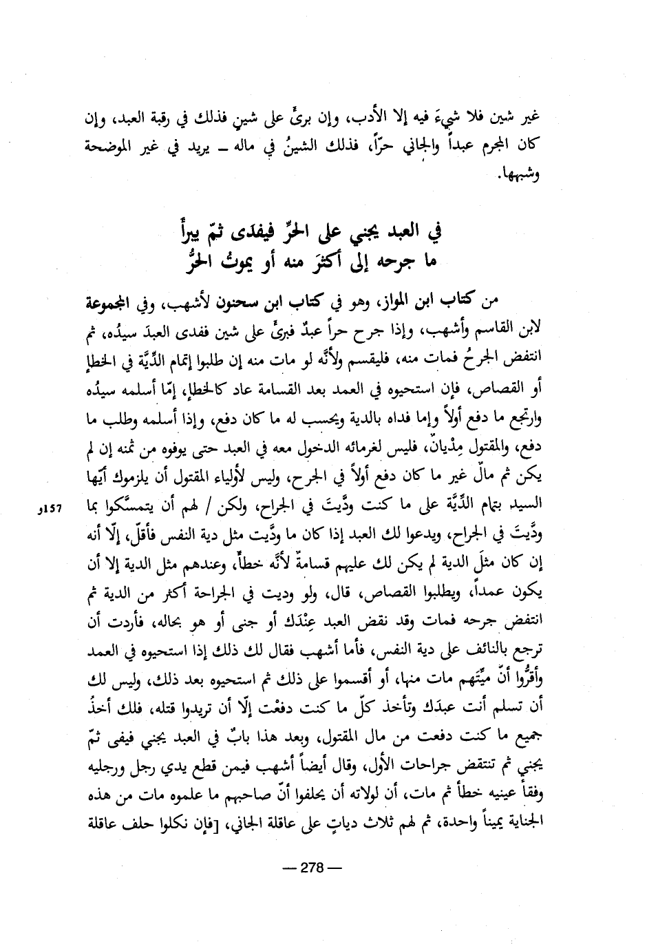 من كتاب ابن المواز، وهو في كتاب ابن سحنون لأشهب، وفي المجموعة لابن القاسم وأشهب، وإذا جرح حرا عبد فبرئ على شين ففدى العبد سيده، ثم انتفض الجرح فمات منه، فليقسم ولأنه لو مات منه إن طلبوا إتمام الدية في الخطإ أو القصاص، فإن استحيوه في العمد بعد القسامة عاد كالخطإ، إما أسلمه سيده وارتجع ما دفع أولا وإما فداه بالدية ويحسب له ما كان دفع، وإذا أسلمه وطلب ما دفع، والمقتول مديان، فليس لغرمائه الدخول معه في العبد حتى يوفوه من ثمنه إن لم يكن ثم مال غير ما كان دفع أولا في الجرح، وليس لأولياء المقتول أن يلزموك أيها السيد بتمام الدية على ما كنت وديت في الجرح، ولكن/ لهم أن يتمسكوا بما وديت في الجرح، ويدعوا لك العبد إذا كان ما وديت مثل دية النفس فأقل، إلا أنه إن كان مثل الدية لم يكن لك عليهم قسامة لأنه خطأ، وعندهم مثل الدية إلا أن يكون عمدا، ويطلبوا القصاص، قال، ولو وديت في الجراحة أكثر من الدية ثم انتفض جرحه فمات وقد نقد العبد عندك أو جنى او هو بحاله، فأردت أن ترجع بالنائف على دية النفس، فأما أشهب فقال لك ذلك إذا استحيوه في العمد وأقروا أن ميتهم مات منها، أو أقسموا على ذلك ثم استحيوه بعد ذلك، وليس لك أن تسلم أنت عبدك وتأخذ كل ما كنت دفعت إلا أن تريدوا قتله، فلك أخذ جميع ما كنت دفعت من مال المقتول، وبعد هذا باب في العبد يجني فيفي ثم يجني ثم تنتقض جراحات الأول، وقال أيضا أشهب فيمن قطع يدي رجل ورجليه وفقأ عينيه خطأ ثم مات، أن لولاته أن يحلفوا أن صاحبهم ما علموه مات من هذه الجناية يمينا واحدة، ثم لهم ثلاث ديات على عاقلة الجاني، [فإن نكلوا حلف عاقلة