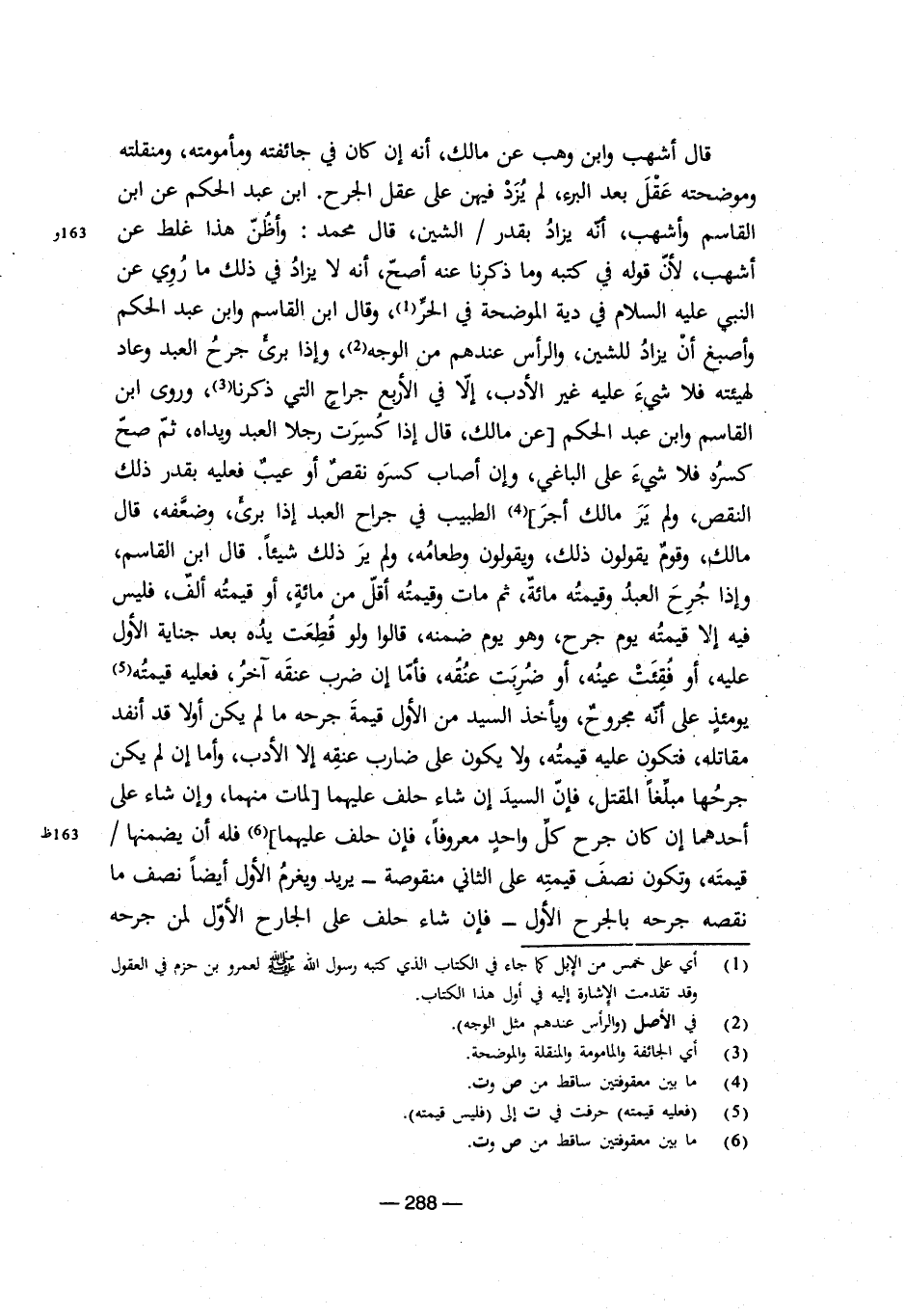 قال أشهب وابن وهب عن مالك، أنه إن كان في جائفته ومأمومته، ومنقلته وموضحته عقل بعد البرء، لم يزد فيهن على عقل الجرح. ابن عبد الحكم عن ابن القاسم وأشهب، أنه يزاد بقدر/ الشين، قال محمد: وأظن هذا غلط عن أشهب، لأن قوله في كتبه وما ذكرنا عنه أصح، أنه لا يزاد في ذلك ما روي عن النبي عليه السلام في دية الموضحة في الحر (¬1)، وقال ابن القاسم وابن عبد الحكم وأصبغ أن يزاد للشين، والرأس عندهم من الوجه (¬2)، وإذا برئ جرح العبد وعاد لهيئته فلا شيء عليه غير الأدب، إلا في الأربع جراح التي ذكرنا (¬3)، وروى ابن القاسم وابن عبد الحكم [عن مالك، قال إذا كسرت رجلا العبد ويداه، ثم صح كسره فلا شيء على الباغي، وإن أصاب كسره نقص أو عيب فعليه بقدر ذلك النقص، ولم ير مالك أجر] (¬4) الطبيب في جراح العبد إذا برئ، وضعفه، قال مالك، وقوم يقولون ذلك، ويقولون وطعامه، ولم ير ذلك شيئا. قال ابن القاسم، وإذا جرح العبد وقيمته مائة، ثم مات وقيمته أقل من مائة، أو قيمته ألف، فليس فيه إلا قيمته يوم جرح، وهو يوم ضمنه، قالوا ولو قطعت يده بعد جناية الأول عليه، أو فقئت عينه، أو ضربت عنقه، فأما إن ضرب عنقه آخر، فعليه قيمته (¬5) يومئذ على انه مجروح، ويأخذ السيد من الأول قيمة جرحه ما لم يكن أولا قد أنفد مقاتله، فتكون عليه قيمته، ولا يكون على ضارب عنقه إلا الأدب، وأما إن لم يكن جرحها مبلغا المقتل، فإن السيد إن شاء حلف عليهما [لمات منهما، وإن شاء على أحدهما إن كان جرح كل واحد معروفا، فإن حلف عليهما] (¬6) فله أن يضمنها/ قيمته، وتكون نصف قيمته على الثاني منقوصة- يريد ويغرم الأول أيضا نصف ما نقصه جرحه بالجرح الأول- فإن شاء حلف على الجارح الأول لمن جرحه