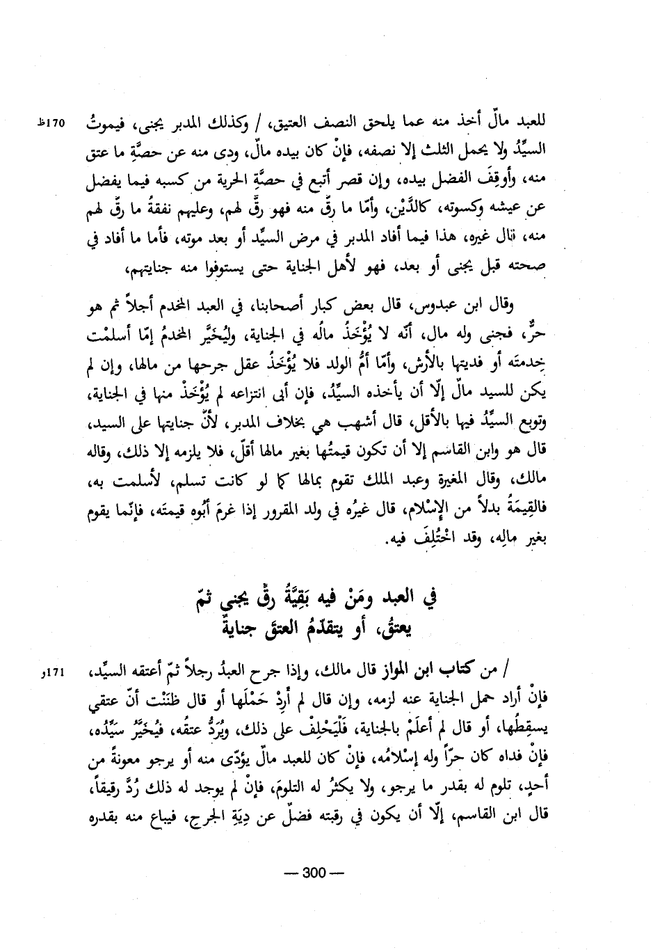 للعبد مال أخذ منه عما يلحق النصف العتيق،/ وكذلك المدبر يجنى، فيموت السيد ولا يحمل الثلث إلا نصفه، فإن كان بيده مال، ودى منه عن حصه ما عتق منه، وأوقف الفضل بيده، وإن قصر أتبع في حصة الحرية من كسبه فيما يفضل عن عيشه وكسوته، كالدين، وأما ما رق منه فهو رق لهم، وعليهم نفقة ما رق لهم منه، قال غيره، هذا فيما أفاد المدبر في مرض السيد أو بعد موته، فأما ما أفاد في صحته قبل يجني أو بعد، فهو لأهل الجناية حتى يستوفوا منه جنايتهم،