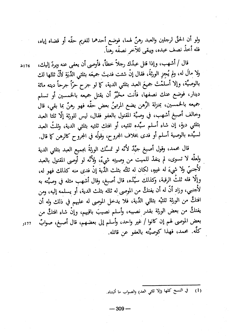 قال محمد، وقول أصبغ جيد لأنه لو تمسك الورثة بجميع العبد بثلثي الدية ولعله لا تسوى، لم ينفذ للميت من وصيته شيء، ولأنه لو أوصى المقتول بالعبد لأجنبي ولا شيء له غيره، لكان له ثلثه بثلث الدية إن فدى منه كذلك فهو له، وإلا فله ثلث الرقبة، وكذلك سيده، قال أصبغ، وقال أشهب مثله في وصيته به لأجنبي، وزاد أن له أن يفتك من الموصى له ثلثه بثلث الدية، أو يسلمه إليه، ومن افتك من الورثة ثلثيه بثلثي الدية، فلا يدخل الموصى له عليهم في ذلك وله أن يفتك من بعض الورثة بقدر نصيبه، وأسلم نصيب باقيهم، وإن شاء افتك من بعض الموصى لهم إن كانوا/ غير واحد، وأسلم إلى بعضهم، قال أصبغ، صواب كله. محمد، فهذا كوصيته بالعفو عن قاتله.