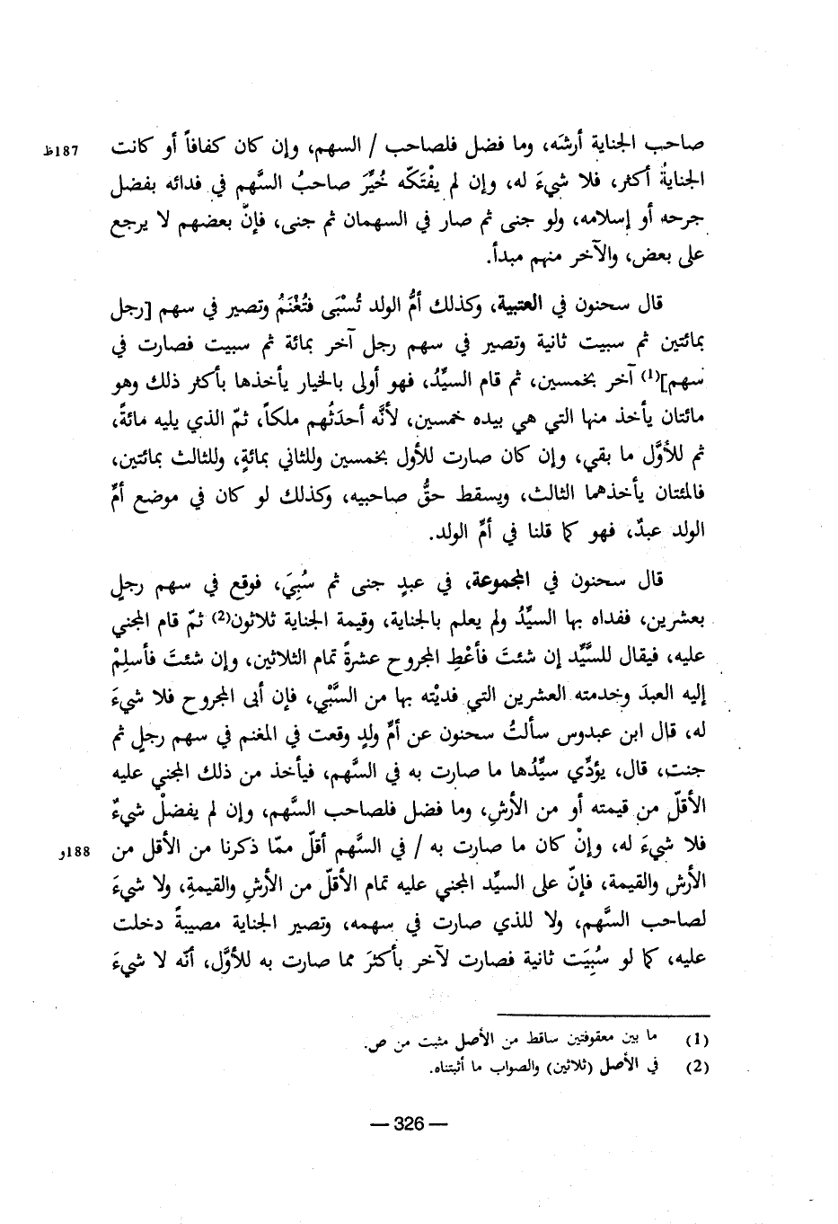 قال سحنون في المجموعة، في عبد جنى ثم سبي، فوقع في سهم رجل بعشرين، ففداه بها السيد ولم يعلم بالجناية، وقيمة الجناية ثلاثون (¬2) ثم قام المجني عليه، فيقال للسيد إن شئت فأعط المجروح عشرة تمام الثلاثين، وإن شئت فأسلم إليه العبد وخدمته العشرين التي فديته بها من السبي، فإن أبى المجروح فلا شيء له، قال ابن عبدوس سألت سحنون عن أم ولد وقعت في المغنم في سهم رجل ثم جنت، قال، يؤدي سيدها ما صارت به في السهم، فيأخذ من ذلك المجني عليه الأقل من قيمته أو من الأرش، وما فضل فلصاحب السهم، وإن لم يفضل شيء فلا شيء له، وإن صارت به/ في السهم أقل مما ذكرنا من الأقل من الأرش والقيمة، فإن على السيد المجني عليه تمام الأقل من الأرش والقيمة، ولا شيء لصاحب السهم، ولا للذي صارت في سهمه، وتصير الجناية مصيبة دخلت عليه، كما لو سبيت ثانية فصارت لآخر بأكثر مما صارت به للأول، أنه لا شيء