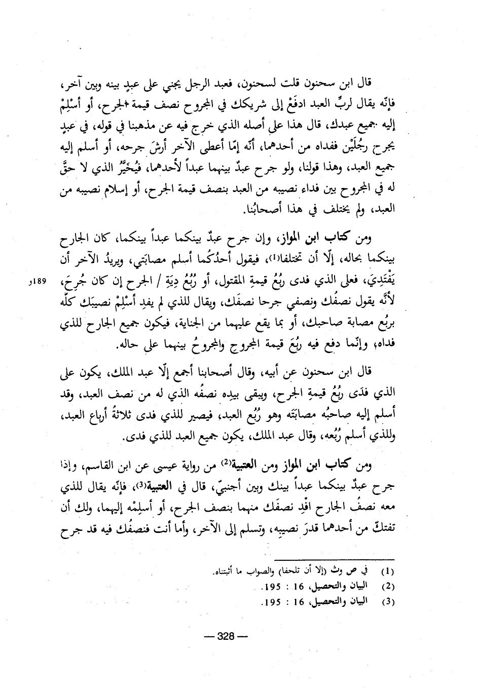 قال ابن سحنون قلت لسحنون، فعبد الرجل يجني على عبد بينه وبين آخر، فإنه يقال لرب العبد ادفع إلى شريكك في المجروح نصف قيمة الجرح، أو أسلم إليه جميع عبدك، قال هذا على أصله الذي خرج فيه عن مذهبنا في قوله، في عبد يجرح رجلين ففداه من أحدهما، أنه إما أعطى الآخر أرش جرحه، أو أسلم إليه جميع العبد، وهذا قولنا، ولو جرح عبد بينهما عبدا لأحدهما، فيخير الذي لا حق له في المجروح بين فداء نصيبه من العبد بنصف قيمة الجرح، أو إسلام نصيبه من العبد، ولم يختلف في هذا أصحابنا.