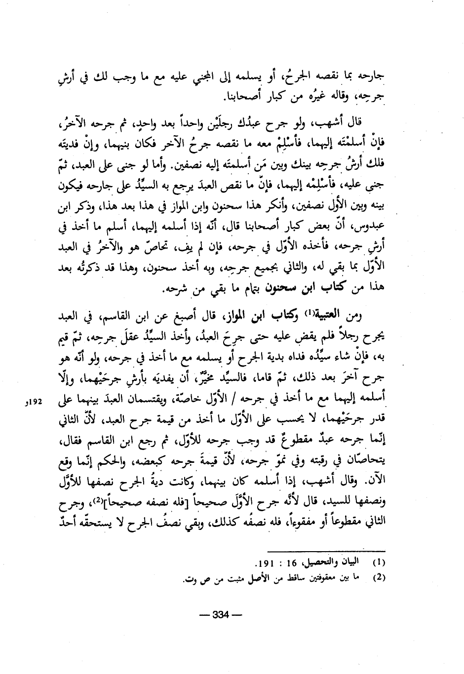 ومن العتبية (¬1) وكتاب ابن المواز، قال أصبغ عن ابن القاسم، في العبد يجرح رجلا فلم يقض عليه حتى جرح العبد، وأخذ السيد عقل جرحه، ثم قيم به، فإن شاء سيده فداه بدية الجرح أو يسلمه مع ما أخذ في جرحه، ولو أنه هو جرح آخر بعد ذلك، ثم قاما، فالسيد مخير، أن يفديه بأرش جرحيهما، وإلا أسلمه إليهما مع ما أخذ في جرحه/ الأول خاصة، ويقتسمان العبد بينهما على قدر جرحيهما، لا يحسب على الأول ما أخذ من قيمة جرح العبد، لأن الثاني إنما جرحه عبد مقطوع قد وجب جرحه للأول، ثم رجع ابن القاسم فقال، يتحاصان في رقبته وفي نمو جرحه، لأن قيمة جرحه كبعضه، والحكم إنما وقع الآن. وقال أشهب، إذا أسلمه كان بينهما، وكانت دية الجرح نصفها للأول ونصفها للسيد، قال لأنه جرح الأول صحيحا [فله نصفه صحيحا] (¬2)، وجرح الثاني مقطوعا أو مفقوءا، فله نصفه كذلك، وبقي نصف الجرح لا يستحقه أحد