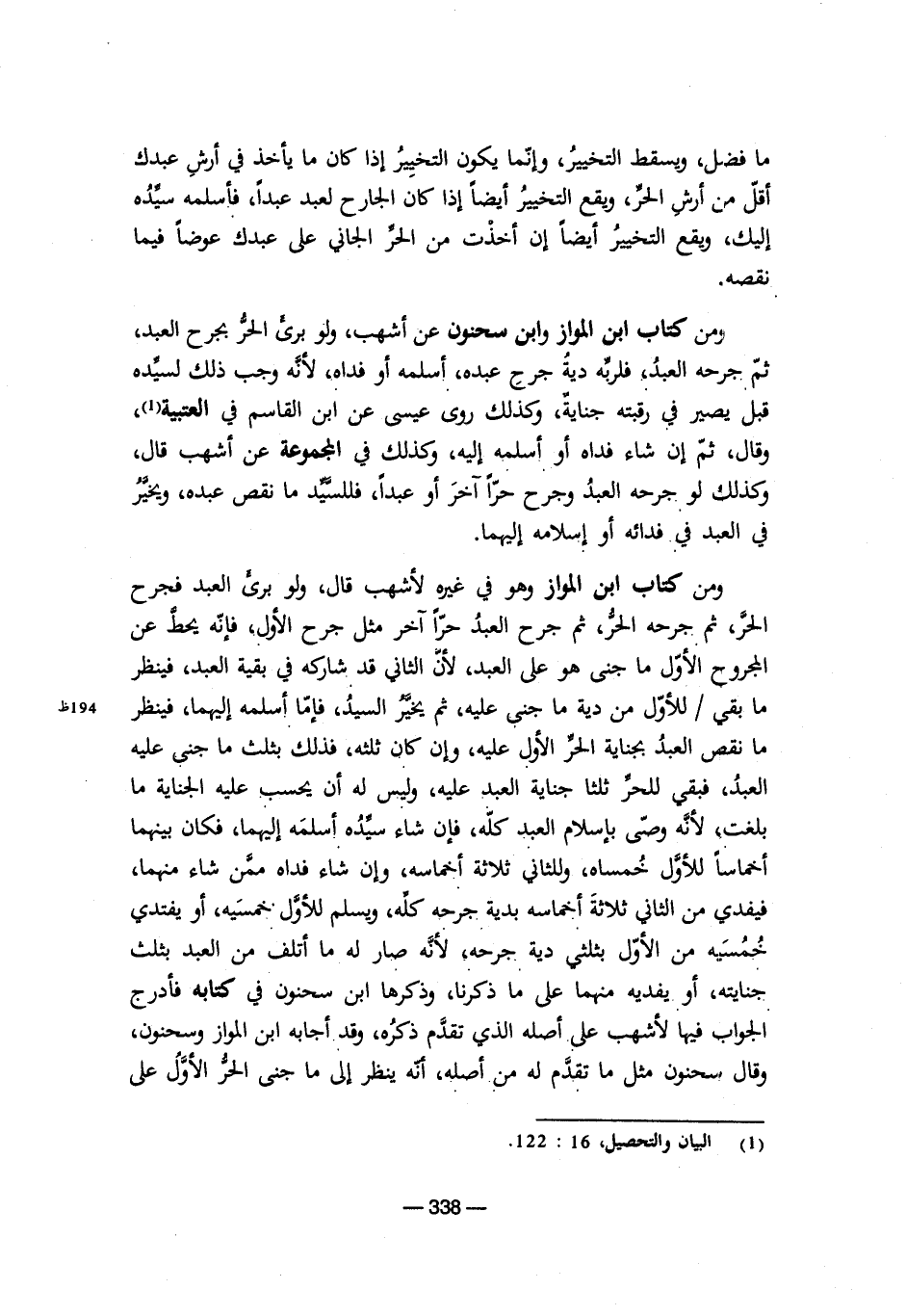 ومن كتا ابن المواز وهو في غيره لأشهب قال، ولو برئ العبد فجرح الحر، ثم جرحه الحر، ثم جرح العبد حراً آخر مثل جرح الأول، فإنه يحط عن المجروح الأول ما جنى هو على العبد، لأن الثاني قد شاركه في بقية العبد، فينظر ما بقي/ للأول من دية ما جنى عليه، ثم يخير السيد، فإما أسلمه إليهما، فينظر ما نقص العبد بجناية الحر الأول عليه، وإن كان ثلثه، فذلك بثلث ما جنى عليه العبد، فبقي للحر ثلثا جناية العبد عليه، وليس له أن يحسب عليه الجناية ما بلغت، لأنه وصى بإسلام العبد كله، فإن شاء سيده أسلمه إليهما، فكان بينهما أخماسا للأول خمساه، وللثاني ثلاثة أخماسه، وإن شاء فداه ممن شاء منهما، فيفدي من الثاني ثلاثة أخماسه بدية جرحه كله، ويسلم للأول خمسيه، أويفتدي خمسيه من الأول بثلثي دية جرحه، لأنه صار له ما أتلف من العبد بثلث جنايته، أو يفديه منهما على ما وذكرها ابن سحنون في كتابه فأدرج الجواب فيها لأشهب على أصله الذي تقدم ذكره، وقد أجابه ابن المواز وسحنون، وقال سحنون مثل ما تقدم له من أصله، أنه ينظر إلى ما جنى الحر الأول على