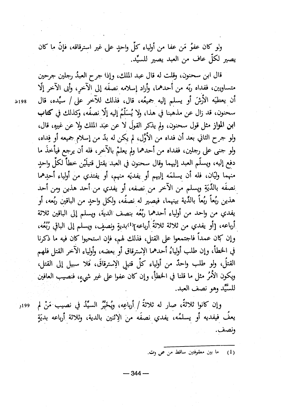 قال ابن سحنون، وقلت له قال عبد الملك، وإذا جرح العبد رجلين جرحين متساويين، ففداه ربه من أحدهما، وأراد إسلامه نصفه إلى الآخر، وأبى الآخر إلا أن يعطيه الآرش أو يسلم إليه جميعه، قال، فذلك للآخر على/ سيده، قال سحنون، قد زال عن مذهبنا في هذا، ولا يسلم إليه إلا نصفه، وكذلك في كتاب ابن المواز مثل قول سحنون، ولم يذكر القول لا عن عبد الملك ولا عن غيره، قال، ولو جرح الثاني بعد أن فداه من الأول، لم يكن له بد من إسلام جميعه أو فداه، ولو جنى على رجلين، ففداه من أحدهما ولم يعلم بالآخر، فله أن يرجع فيأخذ ما دفع إليه، ويسلم العبد إليهما وقال سحنون في العبد يقتل قتيلين خطأً لكل واحد منهما وليان، فله أن يسلمه إليهم أو يفديه منهم، أو يفتدي من أولياء أحدهما نصفه بالدية ويسلم من الآخر من نصفه، أو يفدي من أحد هذين ومن أحد هذين ربُعا ربُعا بالدية بينهما، فيصير له نصفه، ولكل واحد من الباقين ربعه، أو يفدي من واحد من أولياء أحدهما ربعه بنصف الدية، ويسلم إلى الباقين ثلاثة أرباعه، [أو يفدي من ثلاثة ثلاثة أرباعه] (¬1) بدية ونصف، ويسلم إلى الباقي رُبُعُه، وإن كان عمداً فاجتمعوا على القتل، فذلك لهم، فإن استحيوا كان فيه ما ذكرنا في الخطأ، وإن طلب أولياء أحدهما الاسترقاق أو بعضه، وأولياء الآخر القتل فلهم، القتل، ولو طلب واحد من أولياء كل قتيل الاسترقاق، فلا سبيل إلى القتل، ويكون الأمر مثل ما قلنا في الخطأ، وإن كان عفوا على غير شيء، فنصيب العافين للسيد وهو نصف العبد.