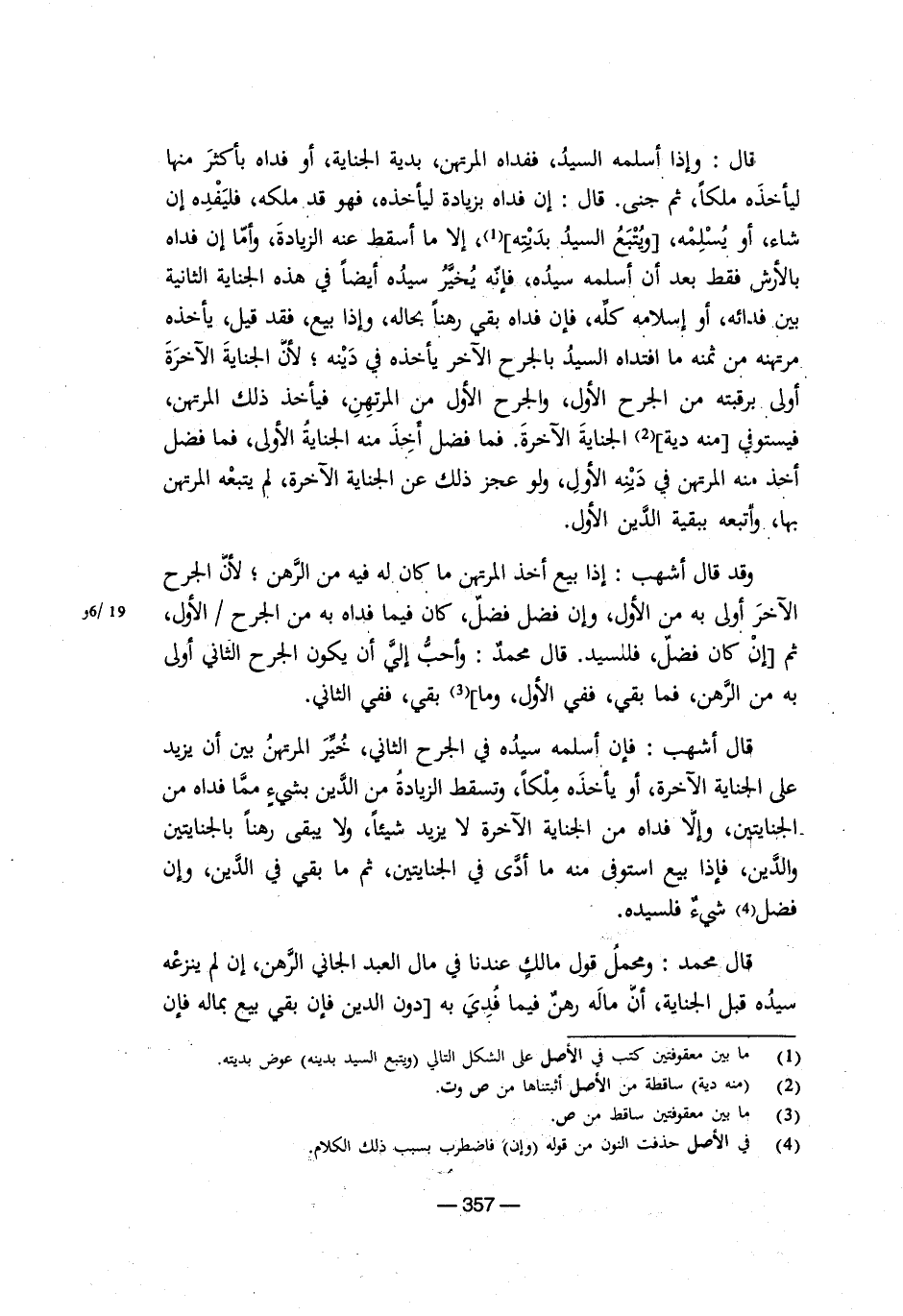 قال محمد: ومحمل قول مالك عندنا في مال العبد الجاني الرهن، إن لم ينزعه سيده قبل الجناية، أن ماله رهن فيما فدي به [دون الدين فإن بقي بيع بماله فإن