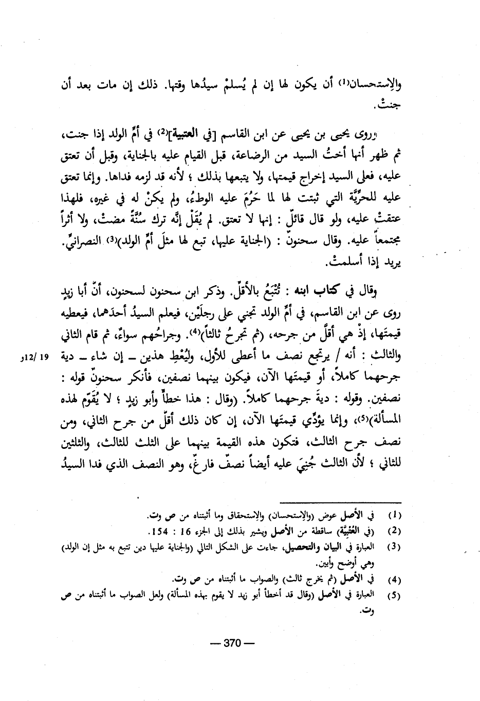 (¬3) العبارة في البيان والتحصيل، جاءت على الشكل التالي (والجناية عليها دين تتبع به مثل إن الولد) وهي أوضح وأبين.