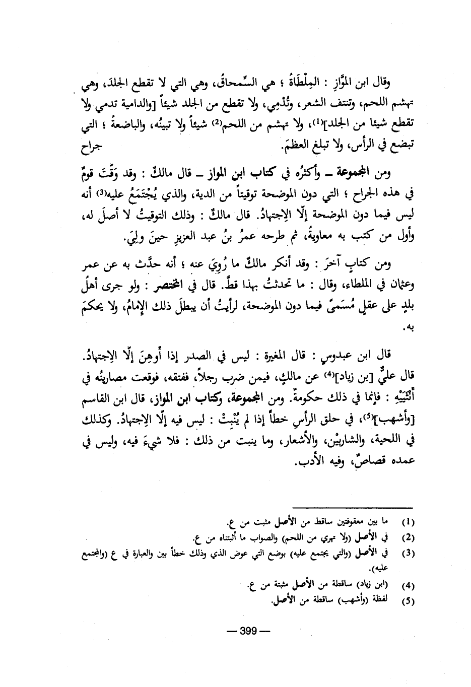 ومن المجموعة- وأكثر في كتاب ابن المواز- قال مالك: وقد وقت قوم في هذه الجراح؛ التي دون الموضحة توقيتا من الدية، والذي يجتمع عليه (¬3) أنه ليس فيما دون الموضحة إلا الاجتهاد. قال مالك: وذلك التوقيت لا أصل له، وأول من كتب به معاوية، ثم طرحه عمر بن عبد العزيز حين ولى.