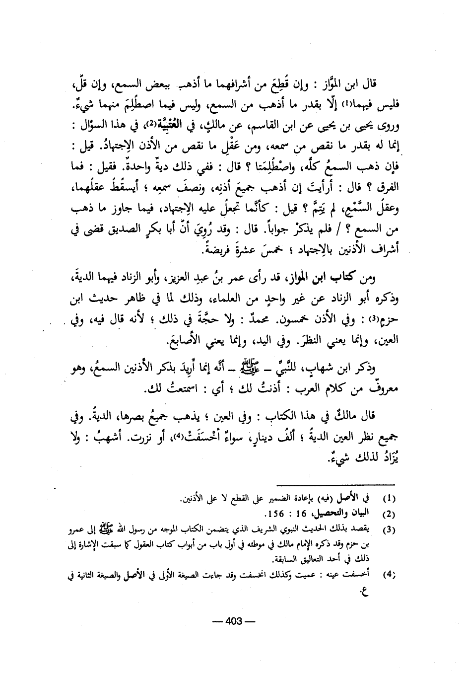 (¬3) يقصد بذلك الحديث النبوي الشريف الذي يتضمن الكتاب الموجه من رسول الله- صلى الله عليه وسلم- إلى عمرو بن حزم وقد ذكره الإمام مالك في موطئة في أول باب من أبواب كتاب العقول كما سبقت الإشارة إلى ذلك في أحد التعاليق السابقة.