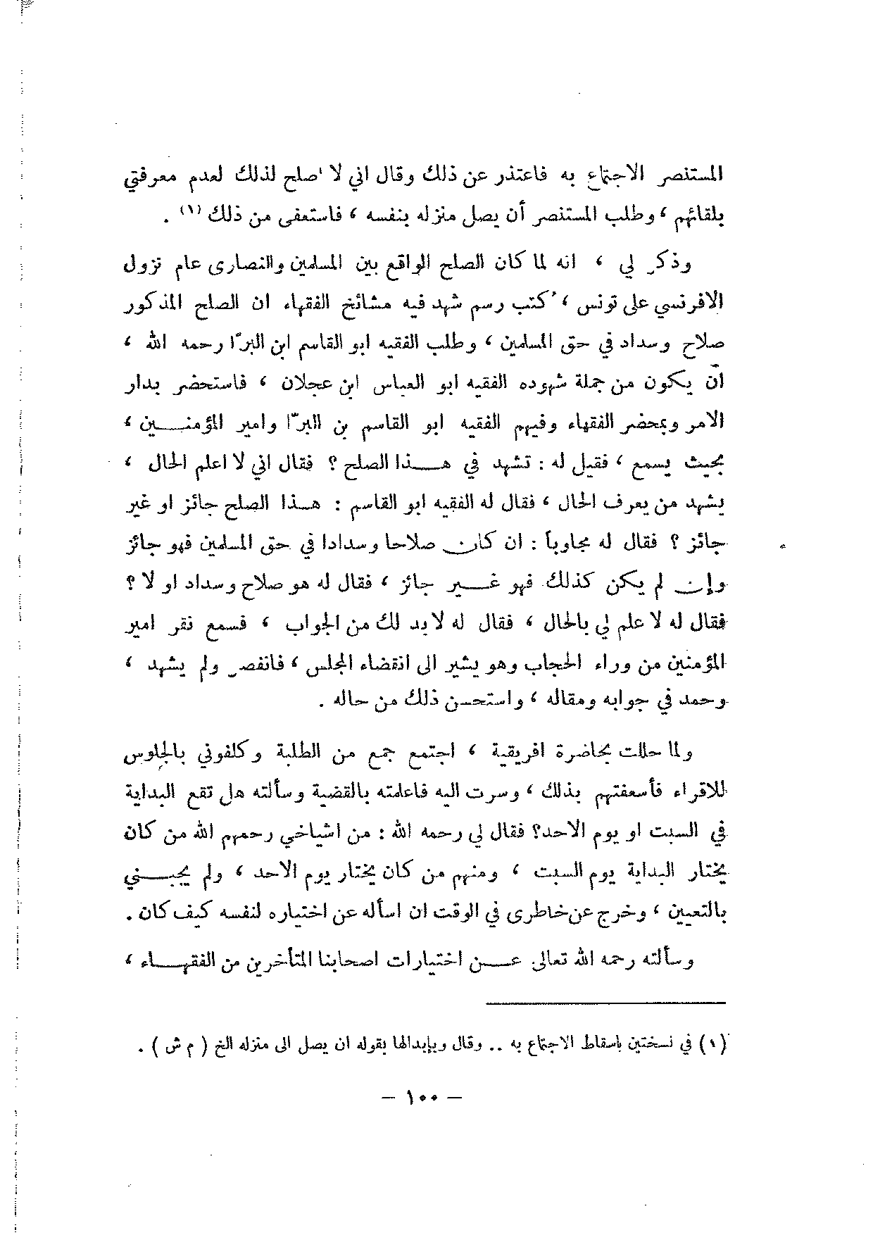 ولما حللت بحاضرة افريقية، اجتمع جمع من الطلبة وكلفوني بالجلوس للإقراء فأسعفتهم بذلك، وسرت إليه فأعلمته بالقضية وسألته هل تقع البداية في السبت أو يوم الأحد؟ فقال لي رحمه الله: من أشياخي رحمهم الله من كان يختار البداية يوم السبت، ومنهم من كان يختار يوم الأحد، ولم يجبني بالتعيين، وخرج عن خاطري في الوقت أن أسأله عن اختياره لنفسه كيف كان.