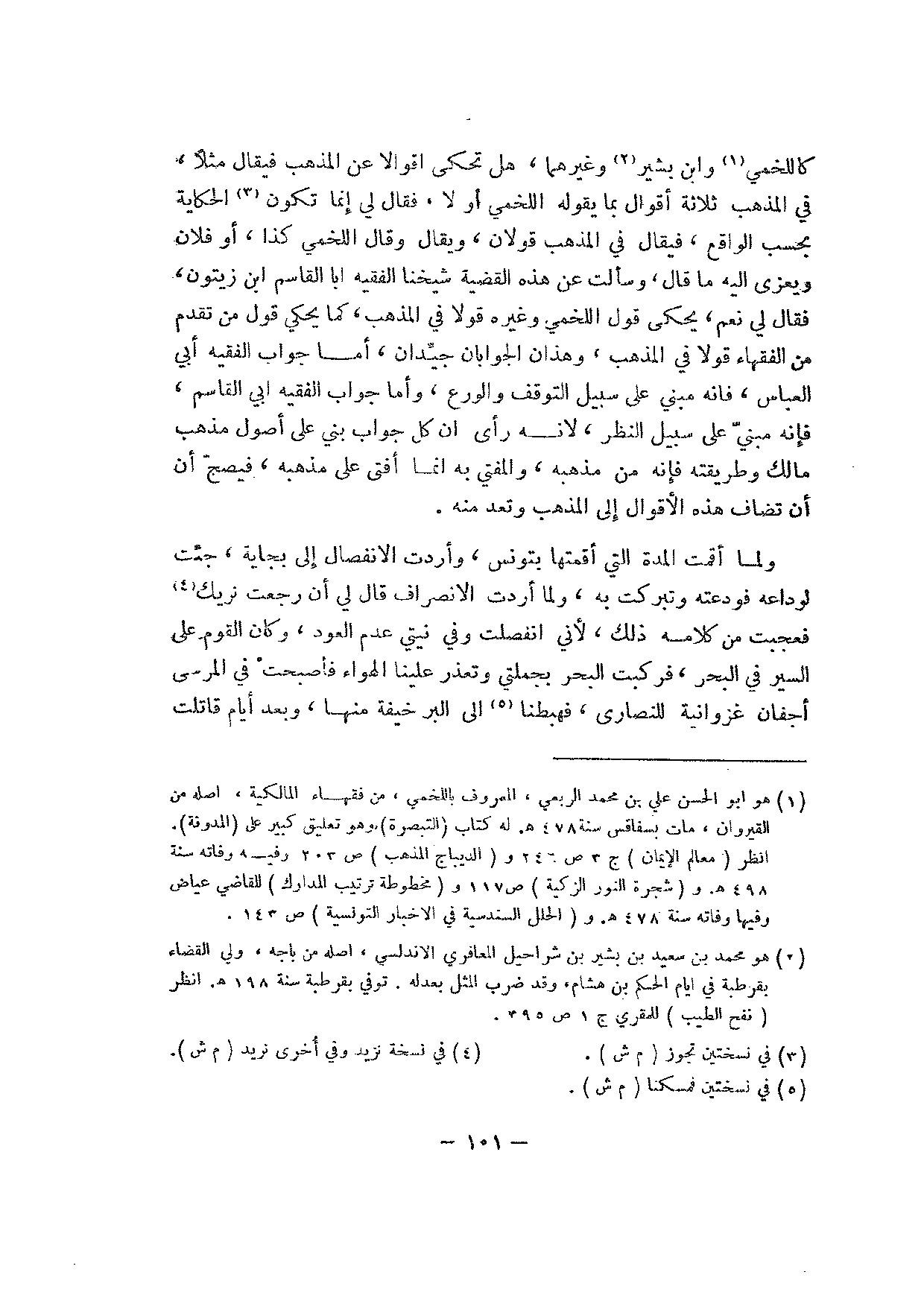 كاللخمي وابن بشير وغيرهما، هل تحكى أقوالا عن المذهب فيقال مثلا، في المذهب ثلاثة أقوال بما يقوله اللخمي أولا، فقال لي إنما تكون الحكاية بحسب الواقع، فيقال في المذهب قولان، ويقال وقال اللخمي كذا، أو فلان ويعزى إليه ما قال، وسألت عن هذه القضية شيخنا الفقيه أبا القاسم ابن زيتون، فقال لي نعم، يحكى قول اللخمي وغيره قولا في المذهب، كما يحكي قول من تقدم من الفقهاء في المذهب، وهذان الجوابان جيدان، أما جواب الفقيه أبي العباس، فإنه مبني على سبيل التوقف والورع، وأما جواب الفقيه أبي القاسم، فإنه مبني على سبيل النظر، لأنه رأى أن كل جواب بني على أصول مذهب مالك وطريقته فإنه من مذهبه، والمفتي به إنما أفتى على مذهبه، فيصح أن تضاف هذه الأقوال إلى المذهب وتعد منه.