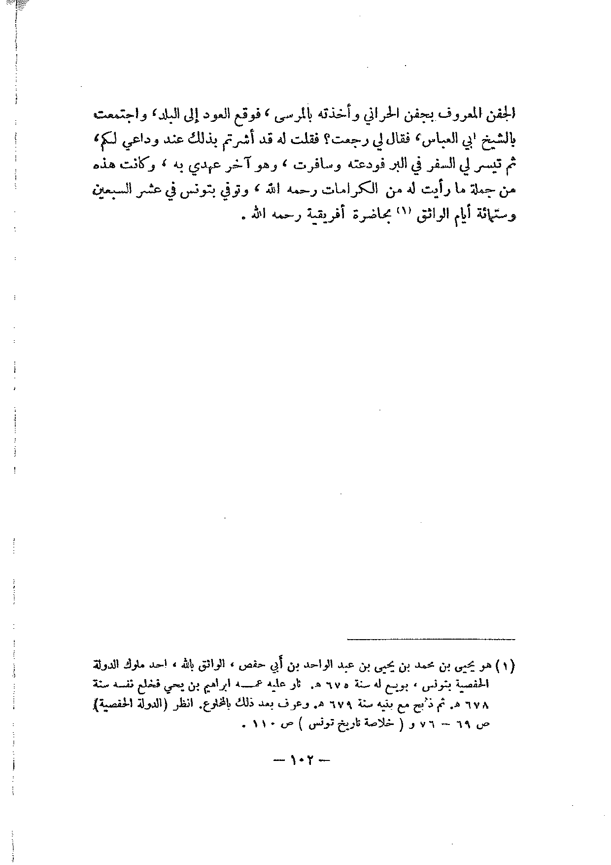 الجفن المعروف بجفن الحراني وأخذته بالمرسى، فوقع العود إلى البلد، واجتمعت بالشيخ أبي العباس، فقال لي رجعت؟ فقلت له قد أشرتم بذلك عند وداعي لكم، ثم تيسر لي السفر في البر فودعته وسافرت، وهو آخر عهدي به، وكانت هذه من جملة ما رأيت له من الكرامات رحمه الله، وتوفي بتونس في عشر السبعين وستمائة أيام الواثق بحاضرة أفريقية رحمه الله.