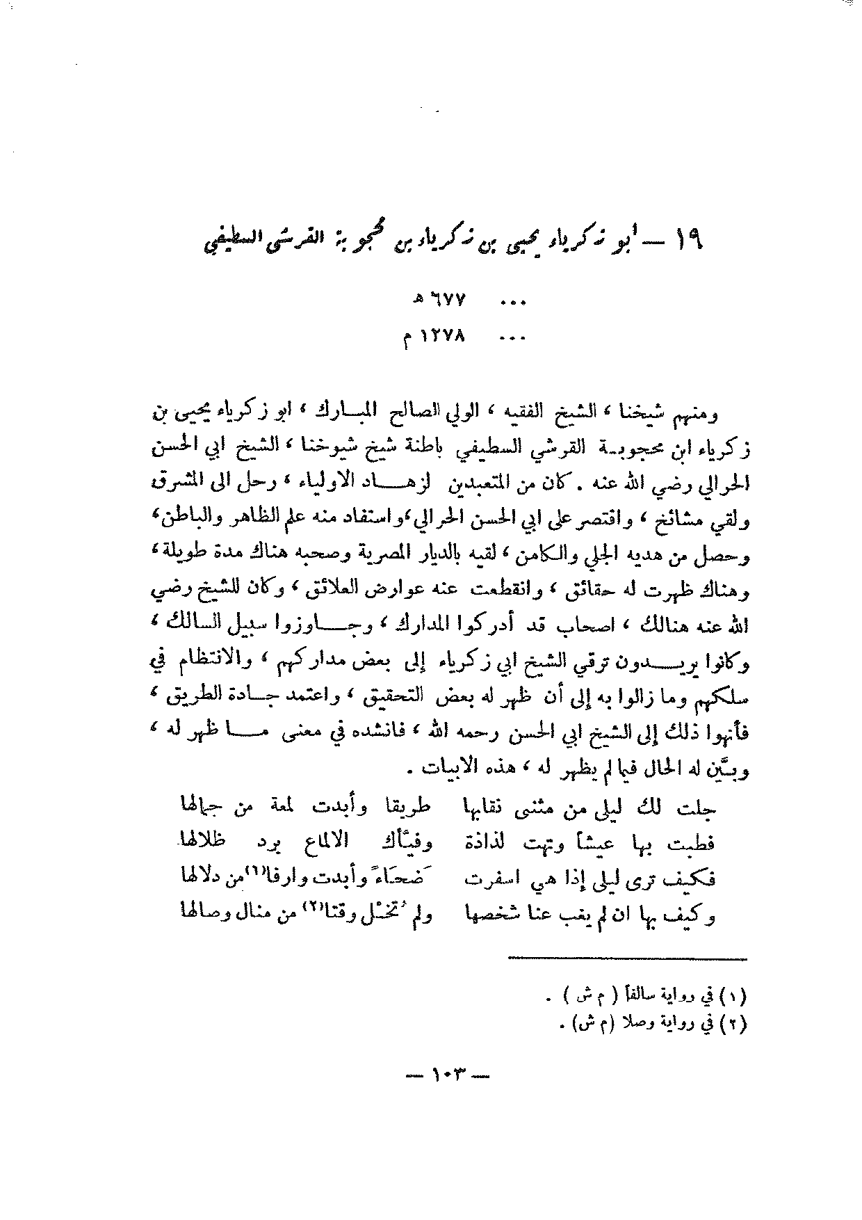 ومنهم شيخنا، الشيخ الفقيه، الولي الصالح المبارك، أبو زكرياء يحيى بن زكرياء ابن محجوبة القرشي السطيفي باطنة شيخ شيوخنا، الشيخ أبي الحسن الحرالي رضي الله عنه. كان من المتعبدين لزهاد الأولياء، رحل إلى المشرق ولقي مشائخ، واقتصر على أبي الحسن الحرالي، واستفاد منه علم الظاهر والباطن، وحصل من هديه الجلي والكامن، لقيه بالديار المصرية وصحبه هناك مدة طويلة، وهناك ظهرت له حقائق، وانقطعت عنه عوارض العلائق، وكان للشيخ رضي الله عنه هنالك، أصحاب قد أدركوا المدراك، وجاوزوا سبيل السالك، وكانوا يريدون ترقي الشيخ أبي زكرياء إلى بعض مداركهم، والانتظام في سلكهم وما زالوا إلى أن ظهر له بعض التحقيق، واعتمد جادة الطريق، فأنهوا ذلك إلى الشيخ أبي الحسن رحمه الله، فأنشده في معنى ما ظهر له، وبين له الحال فيما لم يظهر له، هذه الأبيات.