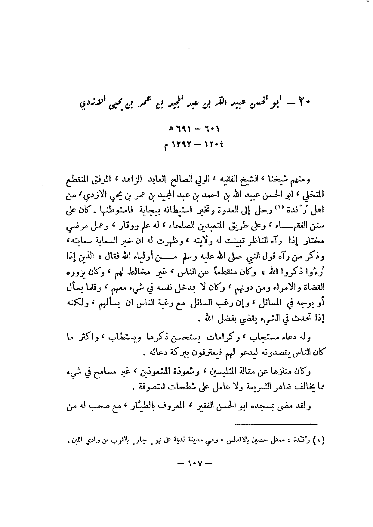 ومنهم شيخنا، الشيخ الفقيه، الولي الصالح العابد الزاهد، الموفق المنقطع المتخلي، أبو الحسن عبيد الله بن أحمد بن عبد المجيد بن عمر بن يحيى الازدي، من أهل رندة رحل إلى العدوة وتخير استيطانه ببجاية فاستوطنها. كان على سنن الفقهاء، وعلى طريق المتعبدين الصلحاء، له علم ووقار، وعمل مرضي مختار إذا رآه الناظر تبينت له ولايته، وظهرت له أن خير السعاية سعايته، وذكر من رآه قول النبي صلى الله عليه وسلم من أولياء الله فقالالذين إذا رءوا ذكروا اللهوكان منقطعا عن الناس، غير مخالط لهم، وكان يزوره القضاة والأمراء ومن دونهم، وكان لا يدخل نفسه في شيء معهم، وقلما يسأل أو يوجه في المسائل، وإن رغب السائل مع رغبة الناس أن يسألهم، ولكنه إذا تحدث في الشيء يقضي بفضل الله.