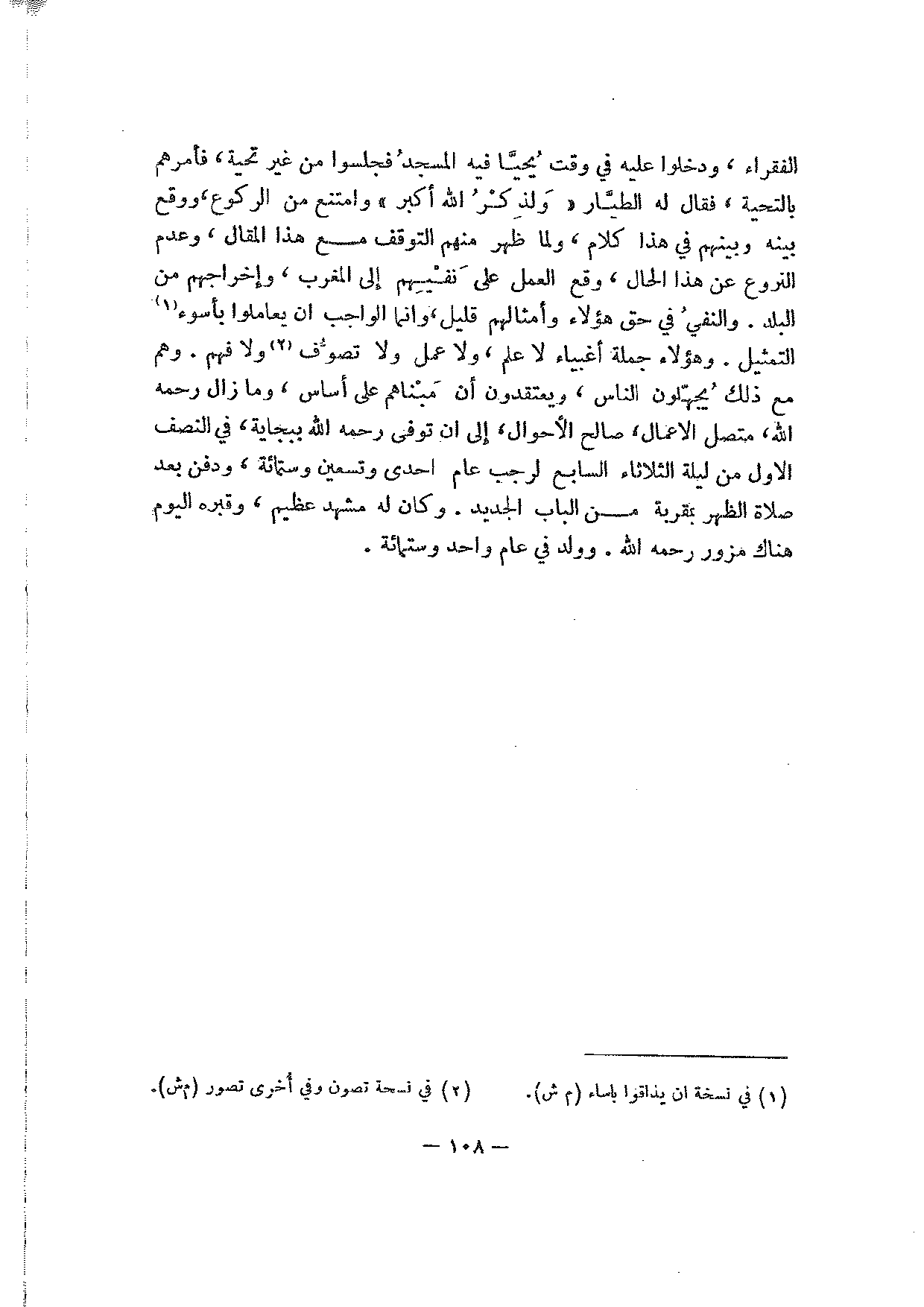 الفقراء، ودخلوا عليه في وقت يحيا فيه المسجد فجلسوا من غير تحية، فأمرهم بالتحية، فقال له الطيار " ولذكر الله أكبر " وامتنع من الركوع، ووقع بينه وبينهم في هذا كلام، ولما ظهر منهم التوقف مع هذا المقال، وعدم النزوع عن هذا الحال، وقع العمل على نفيهم إلى المغرب، وإخراجهم من البلد. والنفي في حق هؤلاء وأمثالهم قليل، وإنما الواجب أن يعاملوا بأسوأ التمثيل. وهؤلاء جملة أغبياء لا علم ولا عمل ولا تصوف ولا فهم. وهم مع ذلك يجهلون الناس، ويعتقدون أن مبناهم على أساس، وما زال رحمه الله، متصل الأعمال، صالح الأحوال، إلى أن توفي رحمه الله ببجاية، في النصف الأول من ليلة الثلاثاء السابع لرجب عام إحدى وتسعين وستمائة، ودفن بعد صلاة الظهر بمقربة من الباب الجديد. وكان له مشهد عظيم، وقبره اليوم هناك مزور رحمه الله. وولد في عام واحد وستمائة.