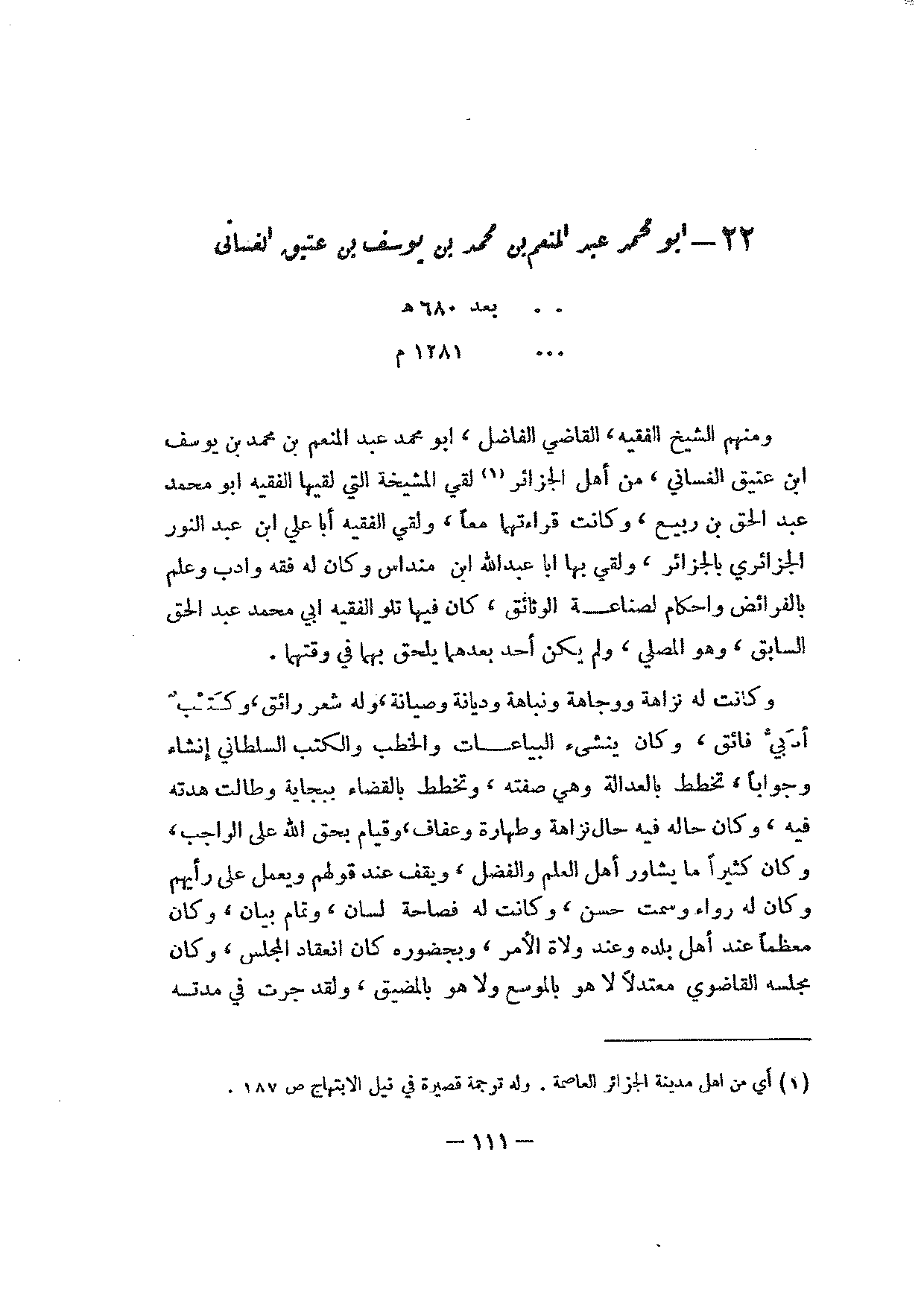 ومنهم الشيخ الفقيه، القاضي الفاضل، أبو محمد عبد المنعم بن محمد بن يوسف ابن عتيق الغساني، من أهل الجزائر لقي المشيخة التي لقيها الفقيه أبو محمد عبد الحق بن ربيع، وكانت قراءتهما معا، ولقي الفقيه أبا علي ابن عبد النور الجزائري بالجزائر، ولقي بها أبا عبد الله ابن منداس وكان له فقه وأدب وعلم بالفرائض وإحكام لصناعة الوثائق، كان فيها تلو الفقيه أبي محمد عبد الحق السابق، وهو المصلي، ولم يكن أحد بعدهما يلحق بهما في وقتهما.