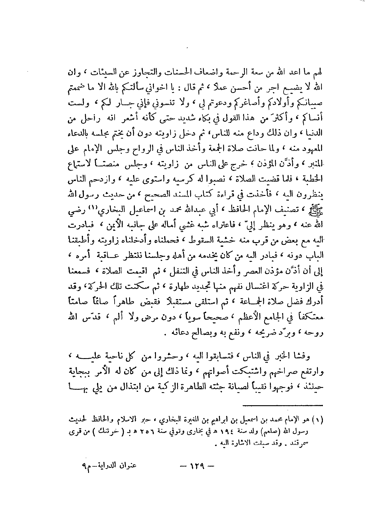 لهم ما أعد الله من سعة الرحمة وأضعاف الحسنات والتجاوز عن السيئات، وإن الله لا يضيع أجر من أحسن عملا، ثم قال: يا إخواني سألتكم بالله إلا ما ضممتم صبيانكم وأولادكم وأصاغركم ودعوتم لي، ولا تنسوني فإني جار لكم، ولست أنساكم، وأكثر من هذا القول في بكاء شديد حتى كأنه أشعر إنه راحل من الدنيا، وان ذلك وداع منه للناس، ثم دخل زاويته دون أن يختم مجلسه بالدعاء المعهودة منه، ولما حانت صلاة الجمعة وأخذ الناس في الرواح وجلس الإمام على المنبر، وأذن المؤذن، خرج على الناس من زاويته، وجلس منصتا لاستماع الخطبة، فلما قضيت الصلاة، نصبوا له كرسيه واستوى عليه، وازدحم الناس ينظرون إليه، فأخذت في قراءة كتاب المسند الصحيح، من حديث رسول الله صلى الله عليه وسلم، تصنيف الإمام الحافظ، أبي عبد الله محمد بن إسماعيل البخاري رضي الله عنه، وهو ينظر إلي، فاعتراه شبه غشي أماله على جانبه الأيمن، فبادرت إليه مع بعض من قرب خشية السقوط، فحملناه وأدخلناه زاويته وأطبقنا الباب دونه، فبادر إليه من كان يخدمه من أهله وجلسنا ننتظر عاقبة أمره، إلى أن أذن مؤذن العصر وأخذ الناس في التنفل، ثم أقيمت الصلاة، فسمعنا في الزاوية حركة اغتسال نفهم منها تجديد طهارة، ثم سكنت تلك الحركة، وقد أدرك فضل صلاة الجماعة، ثم استلقى مستقبلا فقبض طاهرا صائما صامتا معتكفا في الجامع الأعظم، صحيحا سويا، دون مرض ولا ألم، قدس الله روحه، وبرد ضريحه، ونفع به وبصالح دعائه.