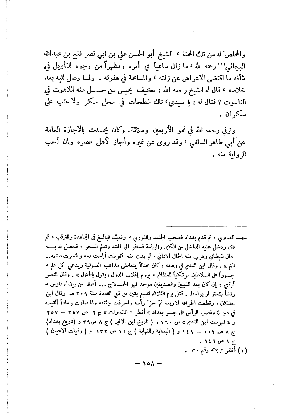والمخلص له في تلك المحنة، الشيخ أبو الحسن علي بن أبي نصر فتح بن عبد الله البجائي رحمه الله، ما زال ساعيا في أمره ومظهرا من وجوه التأويل في شأنه ما اقتضى الإعراض عن زلته، والمسامحة في هفوته. ولما وصل إليه بعد خلاصه، قال له الشيخ رحمه الله: كيف يحبس من حل منه اللاهوت في الناسوت؟ فقال له: يا سيدي، تلك شطحات في محل سكر ولا عيب على سكران.