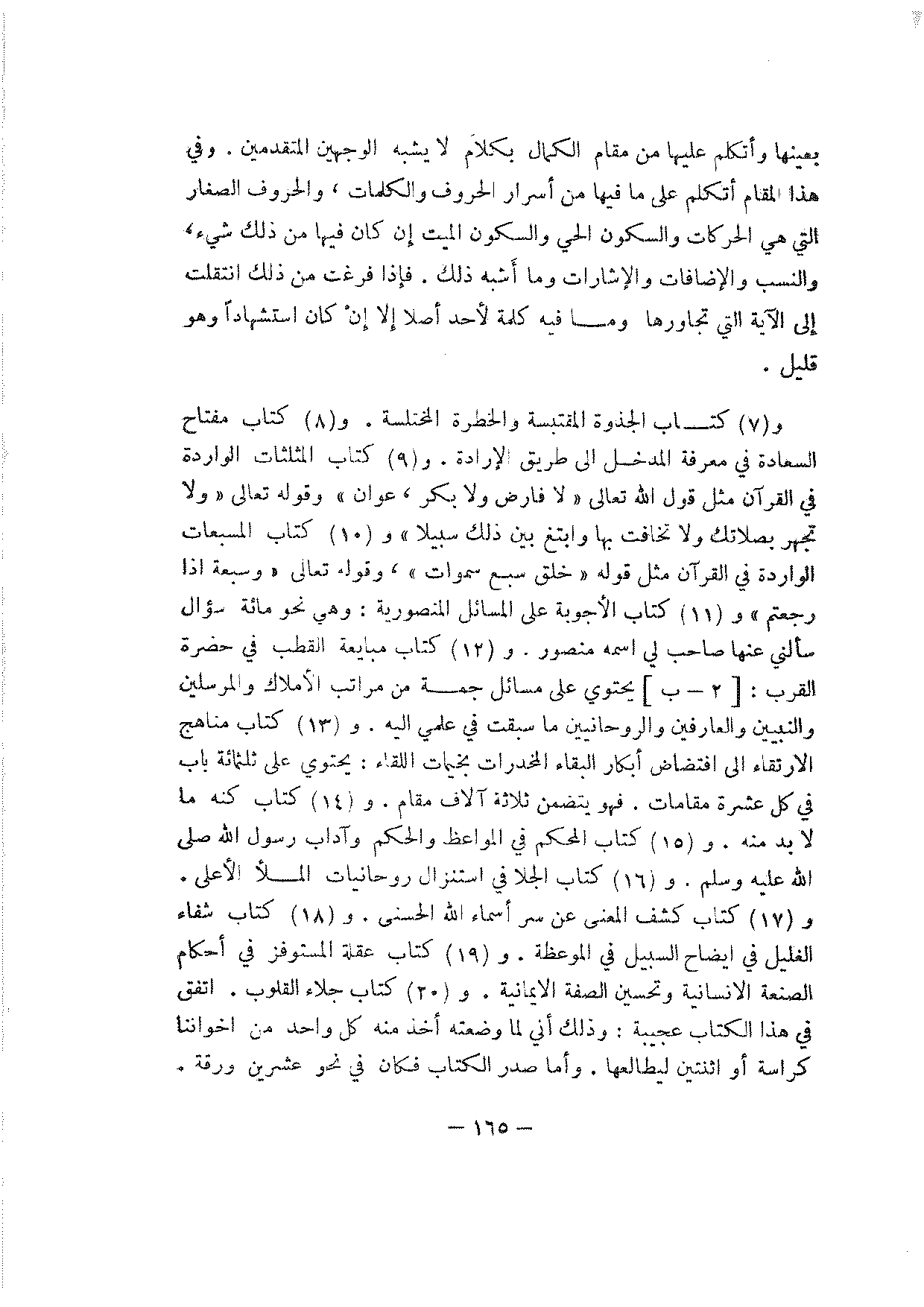و (7) كتاب الجذوة المقتبسة والخطرة المختلسة. و (8) كتاب مفتاح السعادة في معرفة المدخل إلى طريق الإرادة. و (9) كتاب المثلثات الواردة في القرآن مثل قول الله تعالى {لا فارض ولا بكر، عوان} وقوله تعالى {ولا تجهر بصلاتك ولا تخافت بها وابتغ بين ذلك سبيلا} و (10) كتاب المسبعات الواردة في القرآن مثل قوله {خلق سبع سموات}، وقوله تعالى {وسبعة إذا رجعتم} و (11) كتاب الأجوبة على المسائل المنصورية: وهي نحو مائة سؤال سألني عنها صاحب لي اسمه منصور. و (12) كتاب مبايعة القطب في حضرة القرب: [2 - ب] يحتوي على مسائل جمة من مراتب الأملاك والمرسلين والنبيين والعارفين والروحانيين ما سبقت في عملي إليه. و (13) كتاب مناهج الارتقاء إلى افتضاض أبكار البقاء المخدرات بخيمات اللقاء: يحتوي على ثلاثمائة باب في كل عشرة مقامات. فهو يتضمن ثلاثة آلاف مقام. و (14) كتاب كنه ما لا بد منه. و (15) كتاب المحكم في المواعظ والحكم وآداب رسول الله صلى الله عليه وسلم. و (16) كتاب الجلا في استنزال روحانيات الملأ الأعلى. و (17) كتاب كشف المعنى عن سر أسماء الله الحسنى. و (18) كتاب شفاء الغليل في إيضاح السبيل في الموعظة. و (19) كتاب عقلة المستوفز في أحكام الصنعة الإنسانية وتحسين الصفة الإيمانية. و (20) كتاب جلاء القلوب. اتفق في هذا الكتاب عجيبة: وذلك أني لما وضعته أخذ منه كل واحد من إخواننا كراسة أو اثنتين ليطالعها. وأما صدر الكتاب فكان في نحو عشرين ورقة.